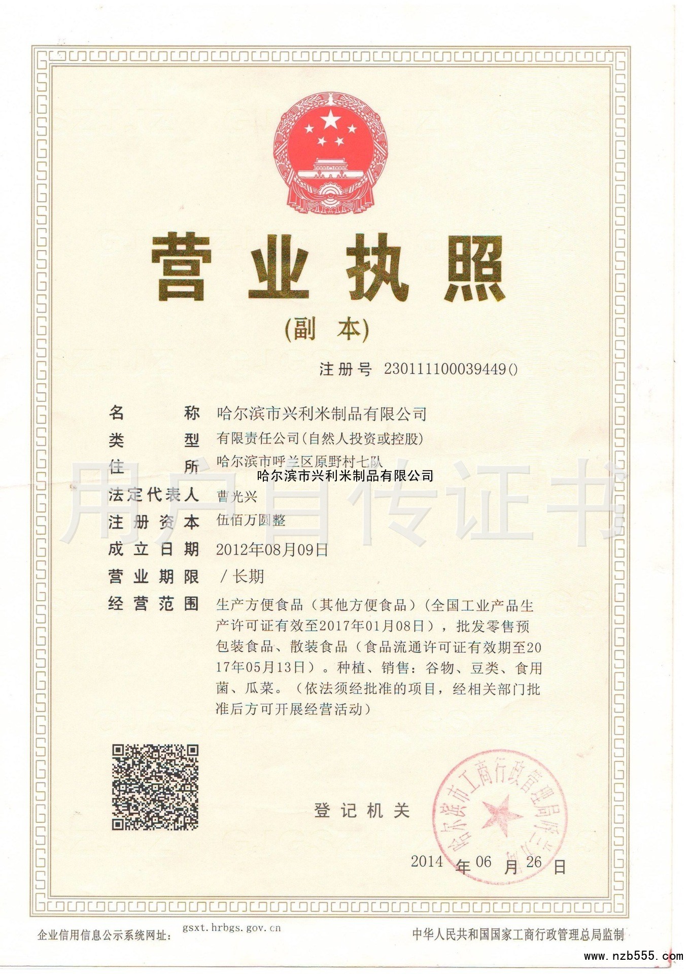 | 發(fā)證機(jī)構(gòu): | 哈爾濱市工商行政管理局 | 發(fā)證時(shí)間 : | 2014-06-26 |