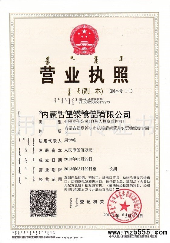 | 發(fā)證機(jī)構(gòu): | 杭錦后旗市場監(jiān)督管理局 | 發(fā)證時(shí)間 : | 2017-06-13 |