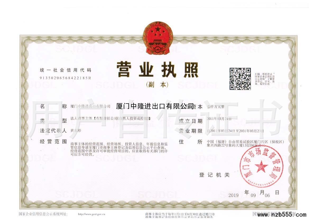 | 發(fā)證機(jī)構(gòu): | 廈門(mén)市市場(chǎng)監(jiān)督管理局 | 發(fā)證時(shí)間 : | 2019-09-06 |