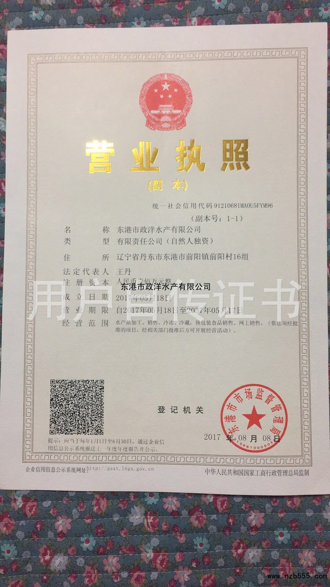 | 發(fā)證機(jī)構(gòu): | 東港市市場(chǎng)監(jiān)督管理局 | 發(fā)證時(shí)間 : | 2017-08-08 |