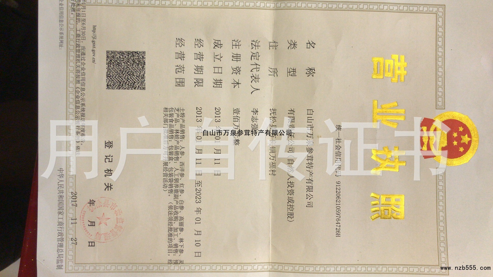 | 發(fā)證機(jī)構(gòu): | 撫松縣市場(chǎng)監(jiān)督管理局 | 發(fā)證時(shí)間 : | 2017-11-27 |