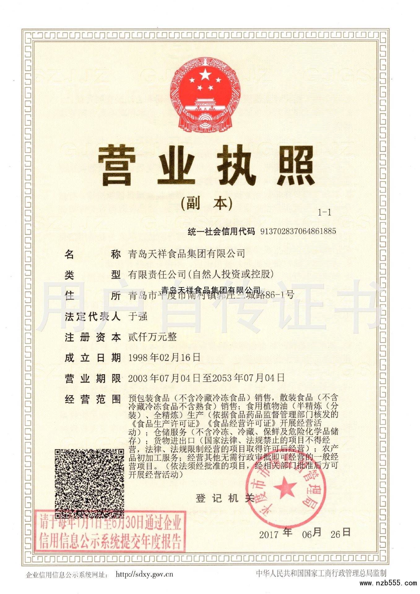 | 發(fā)證機(jī)構(gòu): | 平度市市場(chǎng)監(jiān)督管理局 | 發(fā)證時(shí)間 : | 2017-06-26 |
