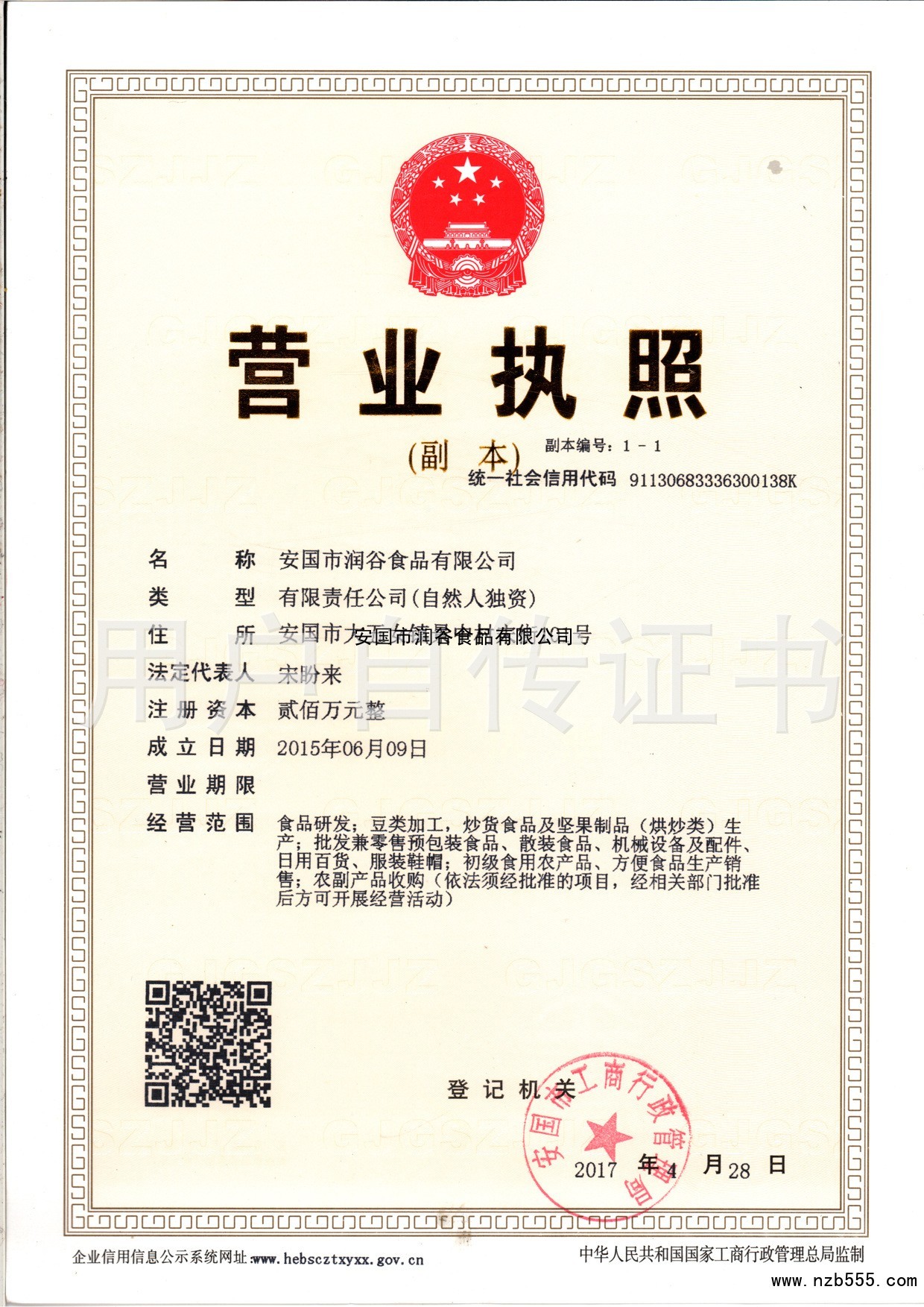 | 發(fā)證機(jī)構(gòu): | 安國市工商行政管理局 | 發(fā)證時(shí)間 : | 2017-04-28 |
