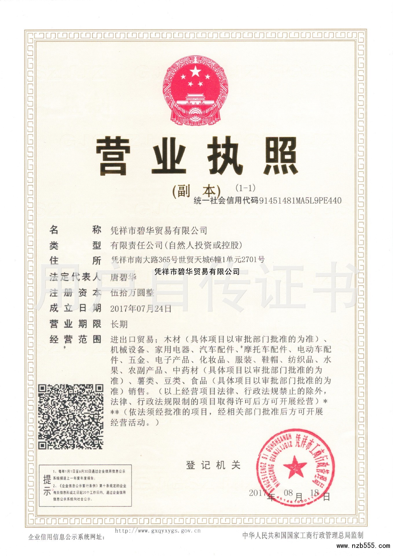 | 發(fā)證機(jī)構(gòu): | 憑祥市工商行政管理局 | 發(fā)證時(shí)間 : | 2017-08-18 |