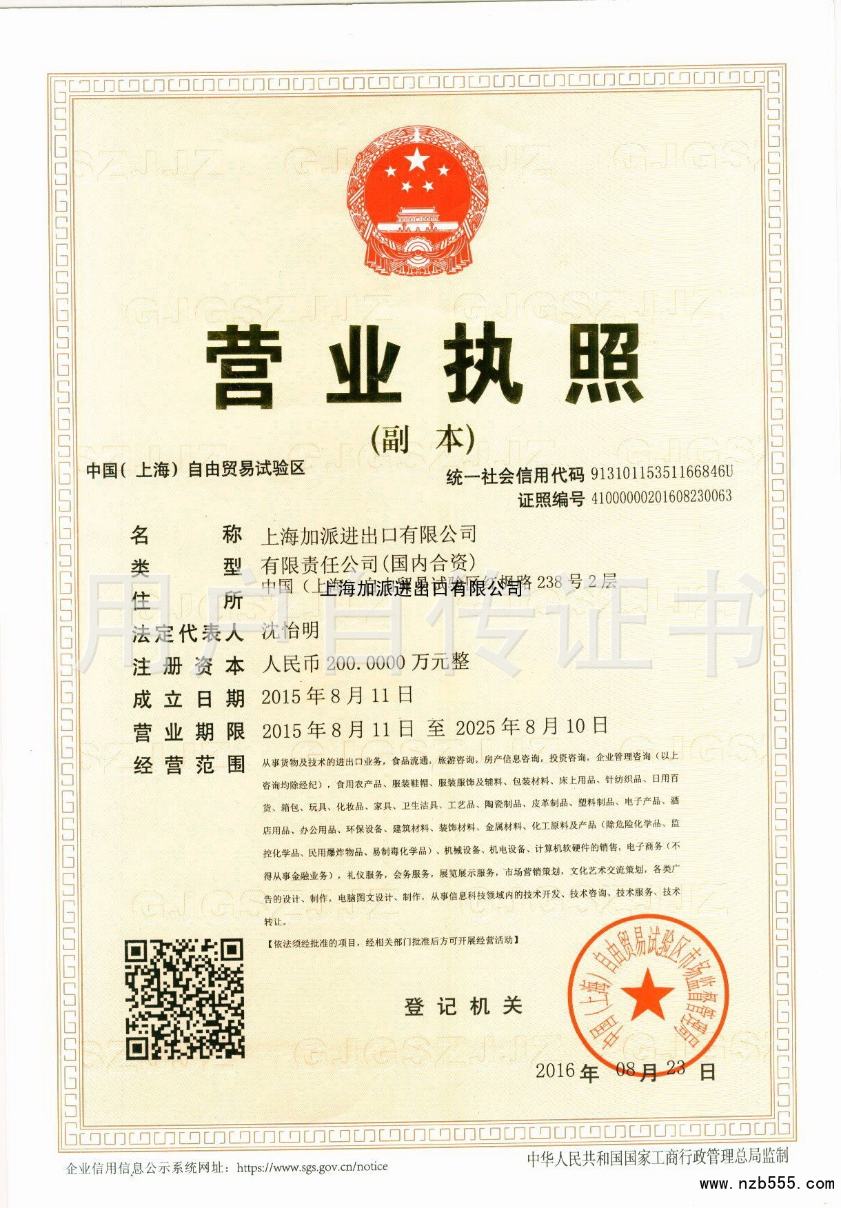 | 發(fā)證機(jī)構(gòu): | 中國(上海)自由貿(mào)易試驗(yàn)區(qū)市場監(jiān)督管理局 | 發(fā)證時間 : | 2016-08-23 |