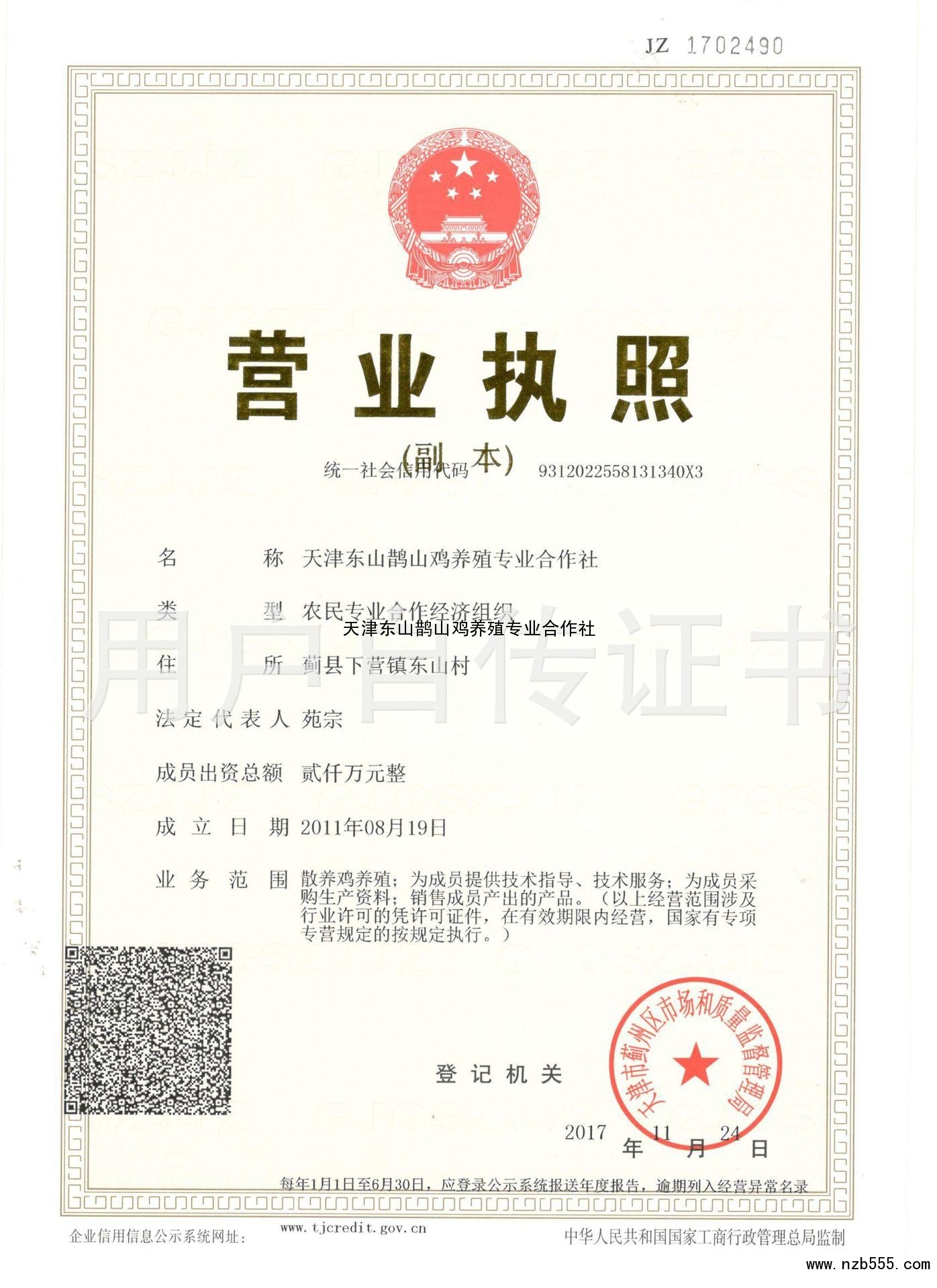 | 發(fā)證機(jī)構(gòu): | 天津市薊州區(qū)市場和質(zhì)量監(jiān)督管理局 | 發(fā)證時(shí)間 : | 2017-11-24 |