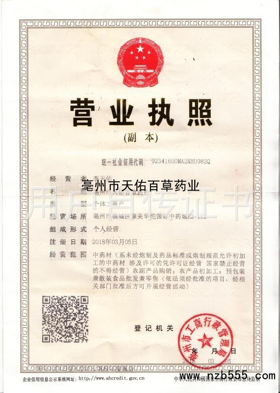 | 發(fā)證機(jī)構(gòu): | 亳州市工商行政管理局 | 發(fā)證時(shí)間 : | 2018-03-05 |