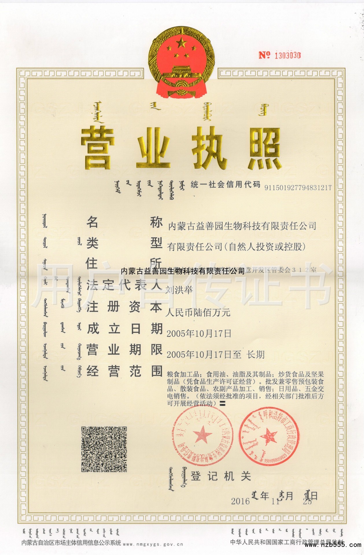 | 發(fā)證機(jī)構(gòu): | 呼和浩特市工商行政管理局 | 發(fā)證時(shí)間 : | 2016-11-25 |