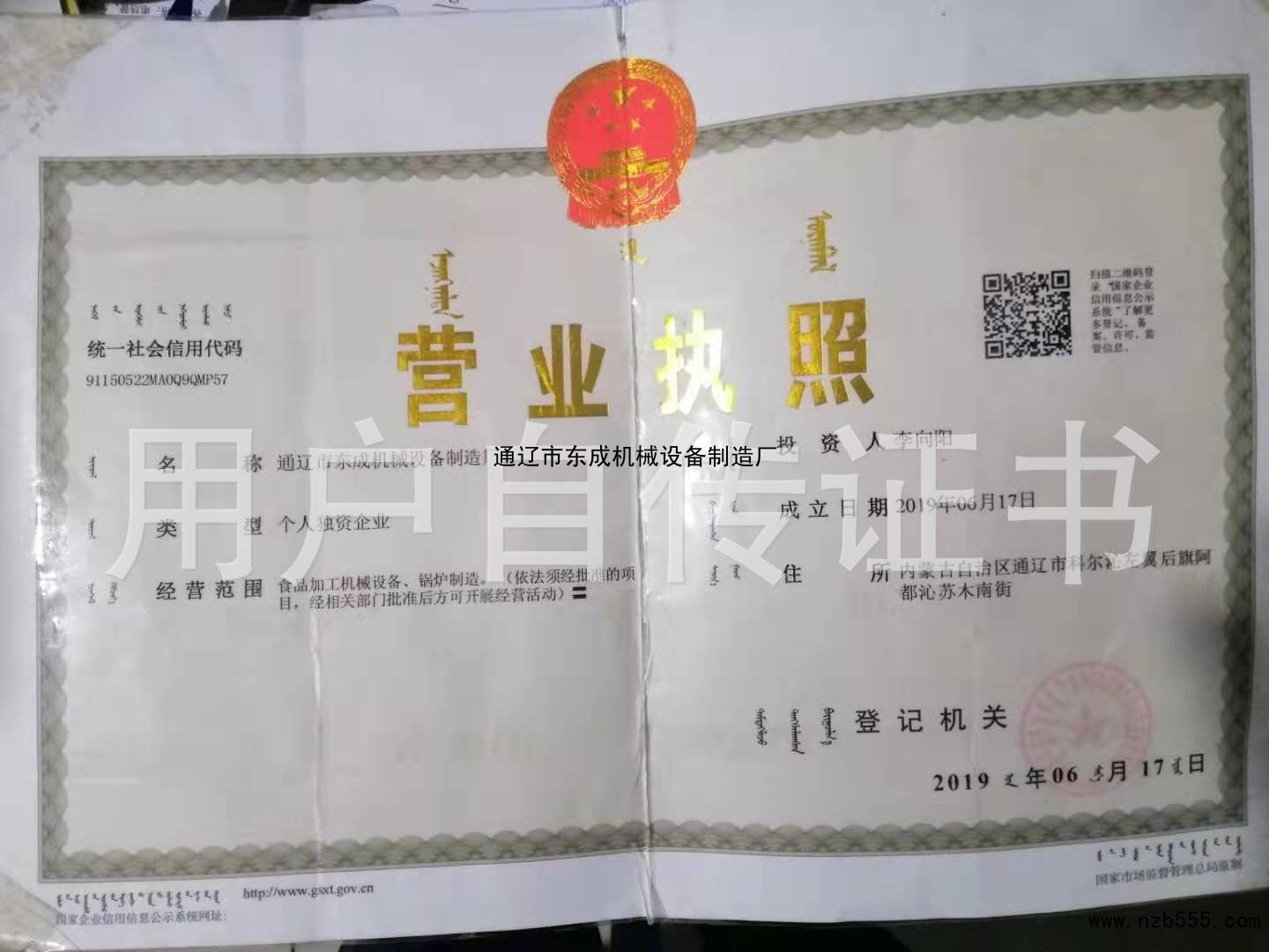 | 發(fā)證機(jī)構(gòu): | 科爾沁左翼后旗市場監(jiān)督管理局 | 發(fā)證時(shí)間 : | 2019-06-17 |