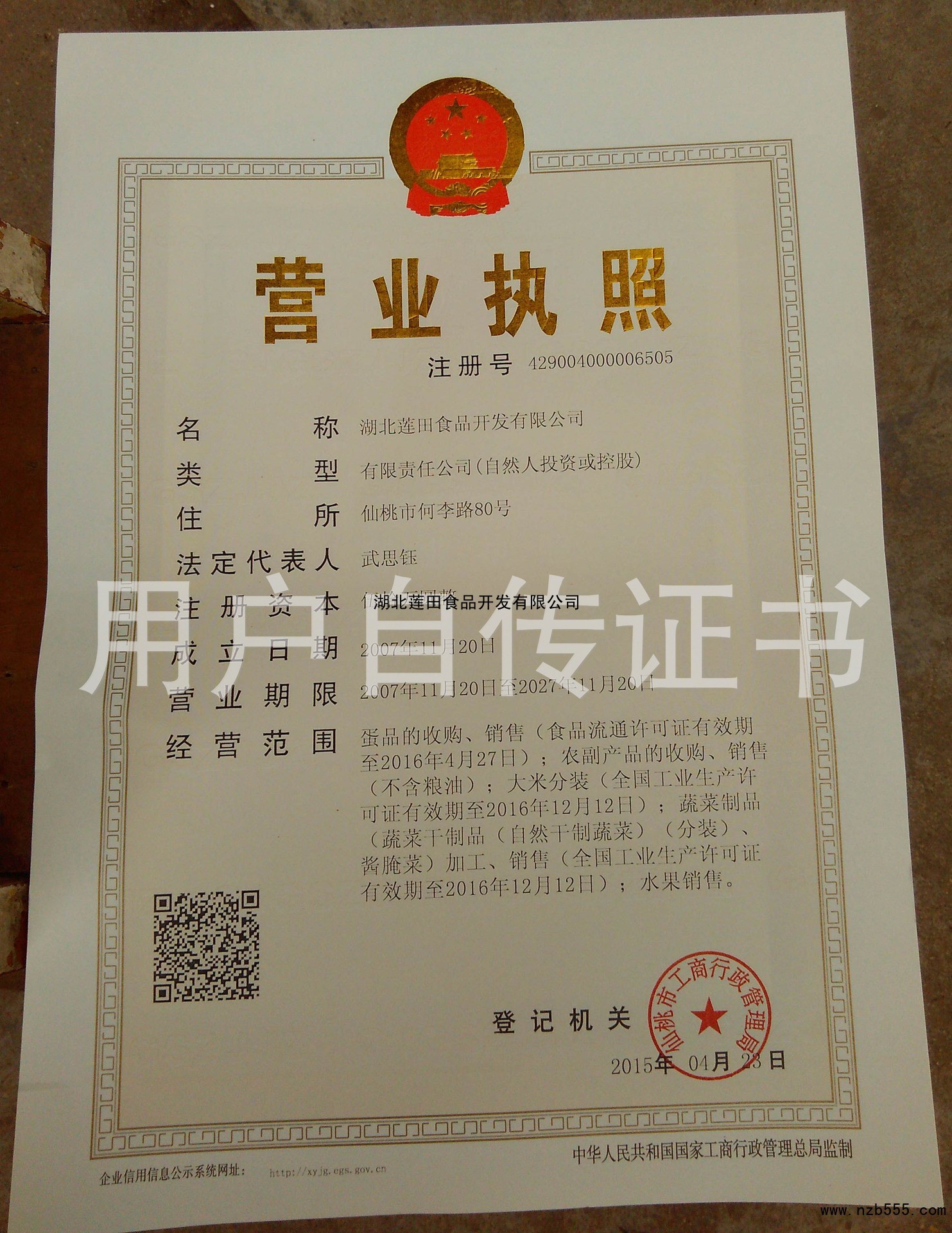 | 發(fā)證機(jī)構(gòu): | 仙桃市工商行政管理局 | 發(fā)證時(shí)間 : | 2015-04-23 |