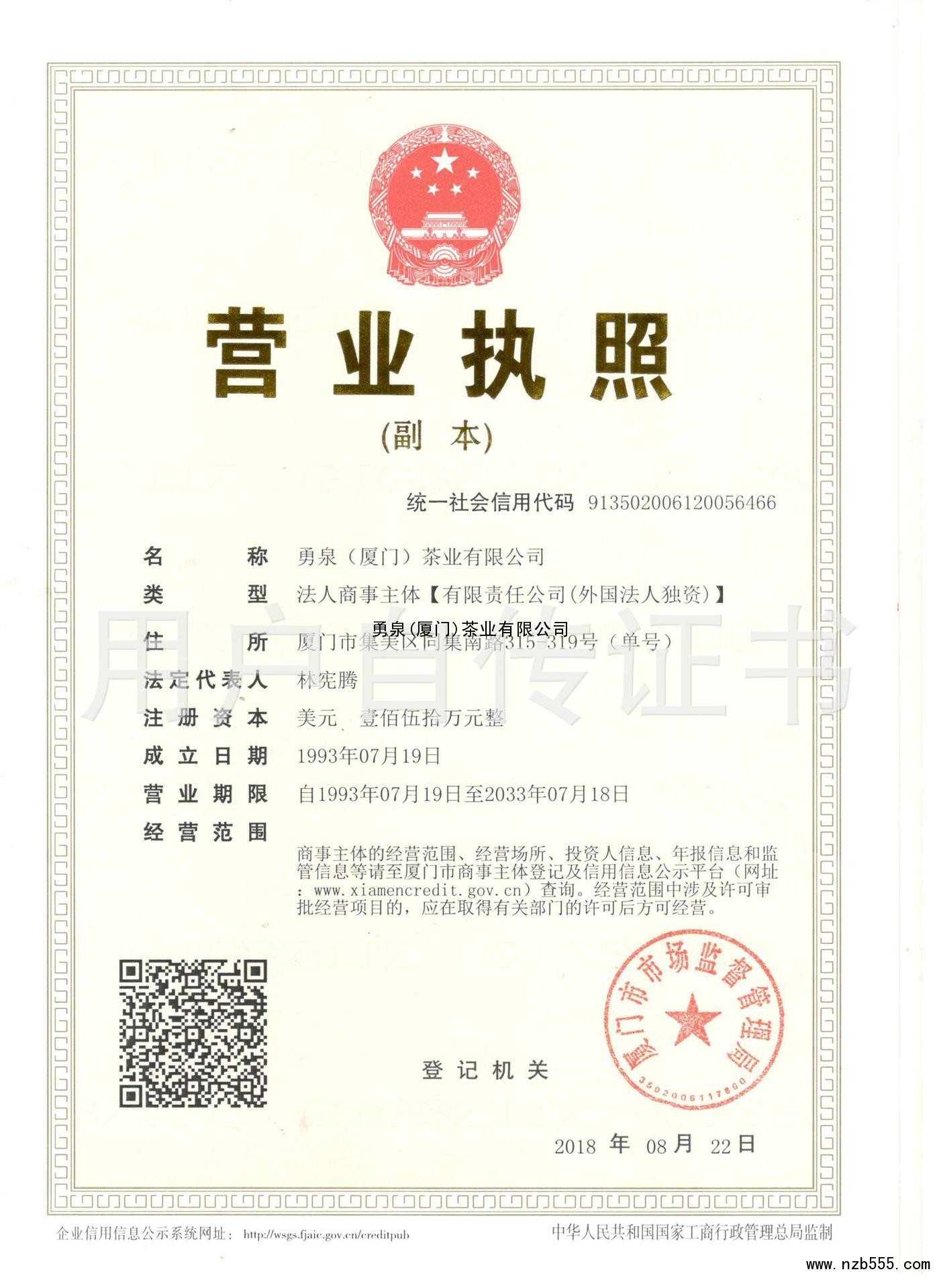 | 發(fā)證機(jī)構(gòu): | 廈門(mén)市市場(chǎng)監(jiān)督管理局 | 發(fā)證時(shí)間 : | 2018-08-22 |