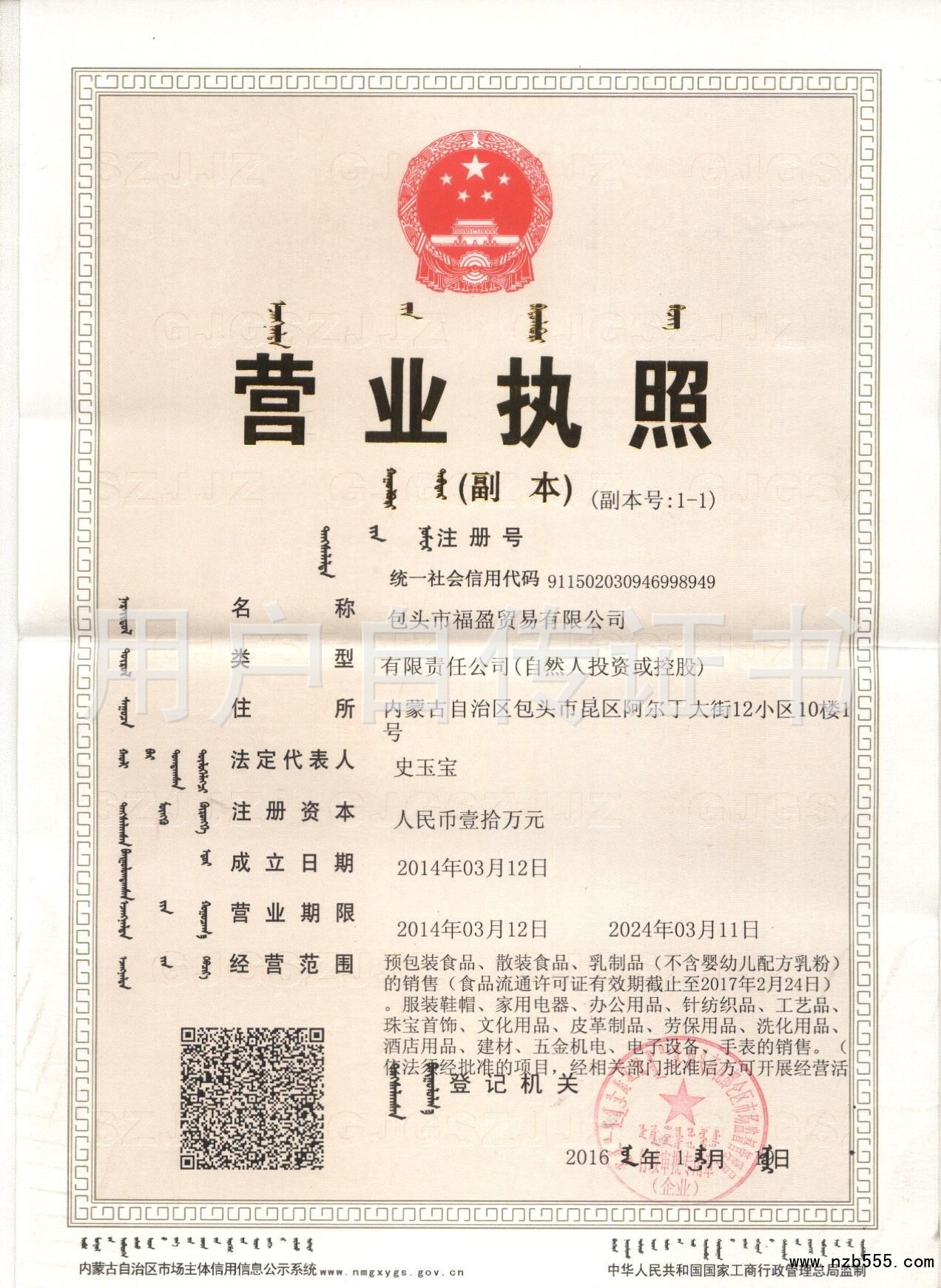 | 發(fā)證機(jī)構(gòu): | 包頭市昆都侖區(qū)市場(chǎng)監(jiān)督管理局 | 發(fā)證時(shí)間 : | 2016-01-19 |