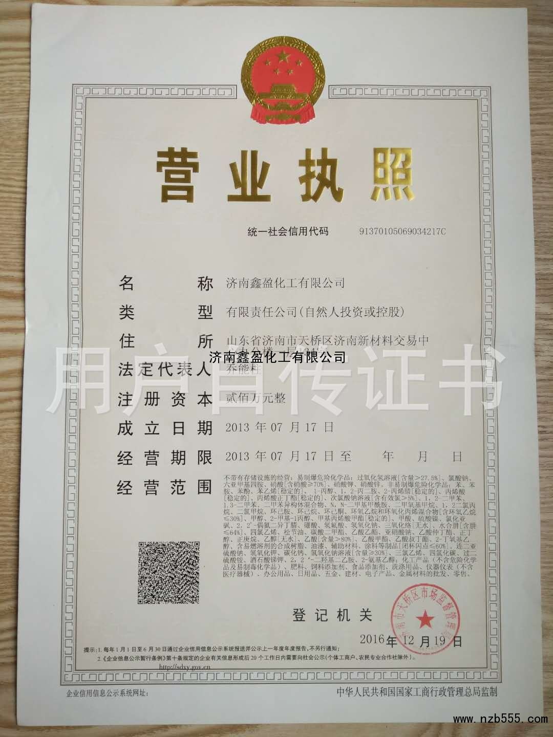 不帶有存儲設(shè)施的經(jīng)營:《危險化學(xué)品經(jīng)營許可證》 魯濟危化經(jīng)【2019】003354號許可...