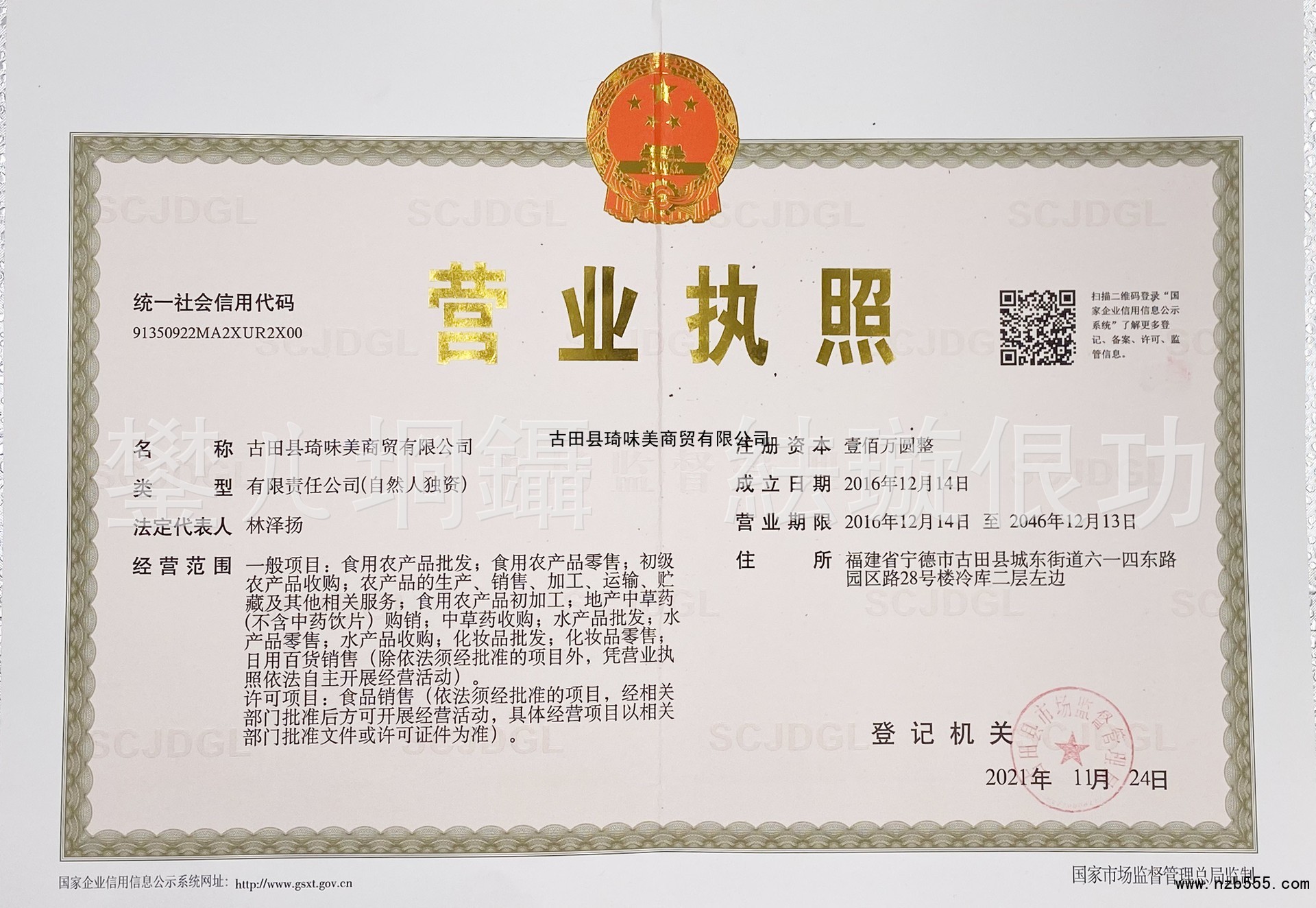 | 發(fā)證機(jī)構(gòu): | 古田縣市場(chǎng)監(jiān)督管理局 | 發(fā)證時(shí)間 : | 2021-11-24 |