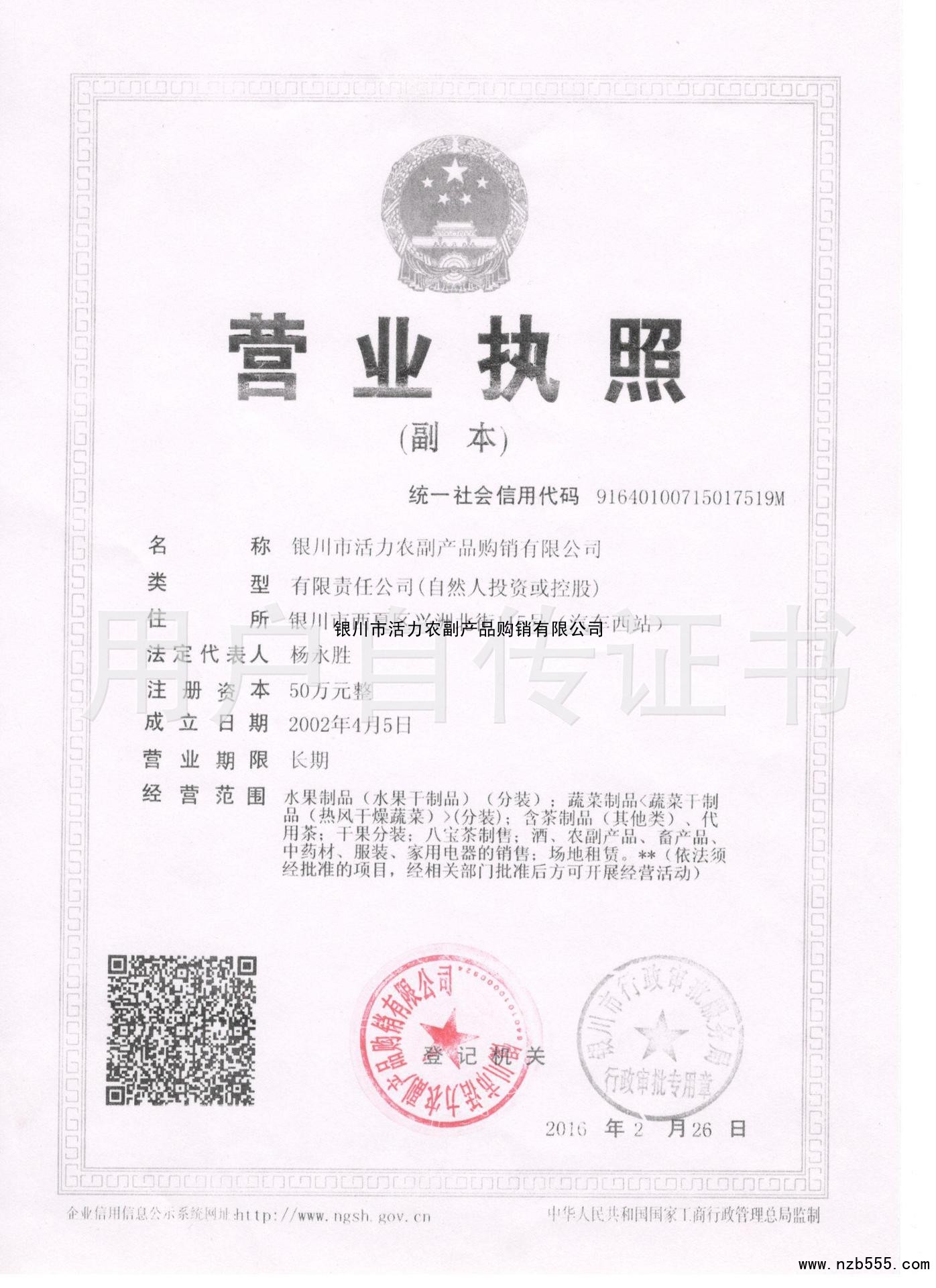 | 發(fā)證機(jī)構(gòu): | 銀川市行政審批服務(wù)局 | 發(fā)證時(shí)間 : | 2016-02-26 |
