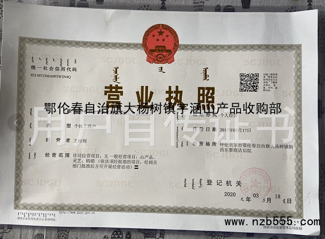 | 發(fā)證機(jī)構(gòu): | 鄂倫春自治旗工商行政管理局 | 發(fā)證時(shí)間 : | 2020-03-18 |