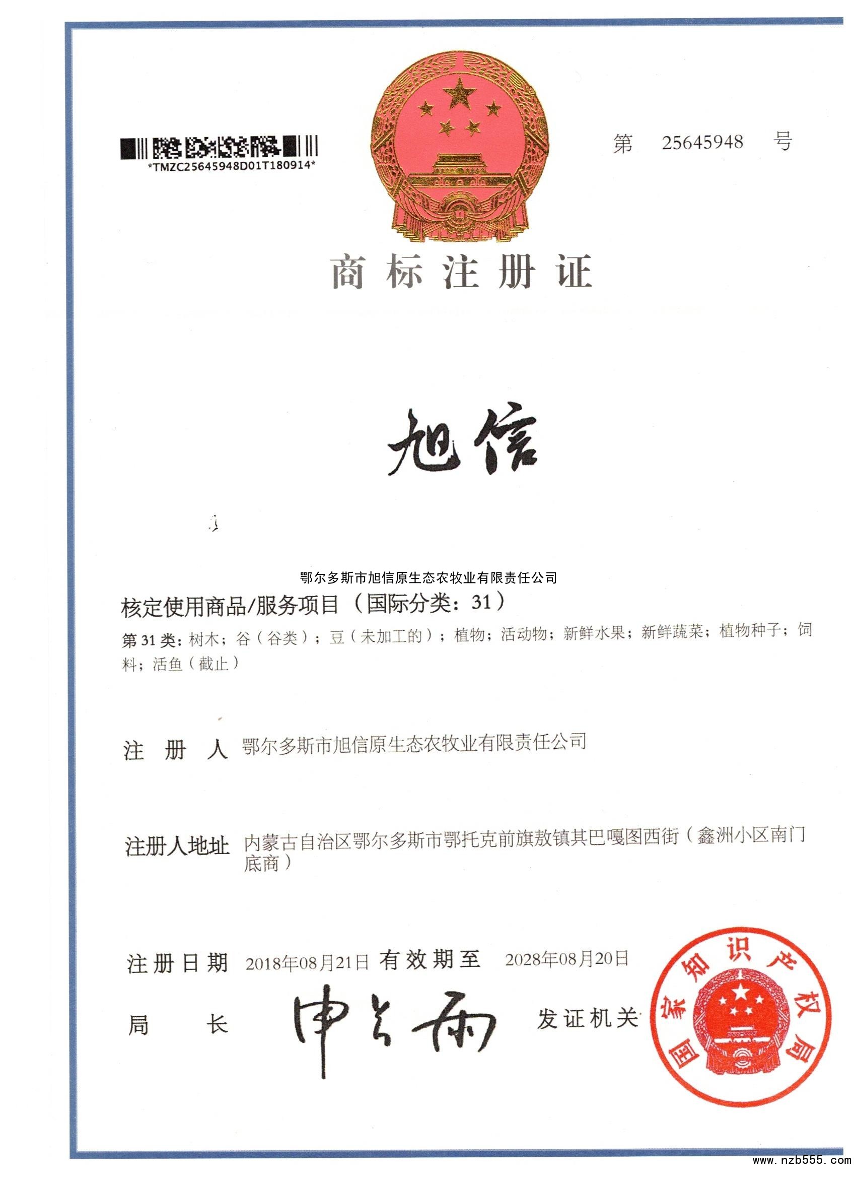 首頁(yè) > 榮譽(yù)資質(zhì) > 商標(biāo)注冊(cè)證 旭信 第31類
