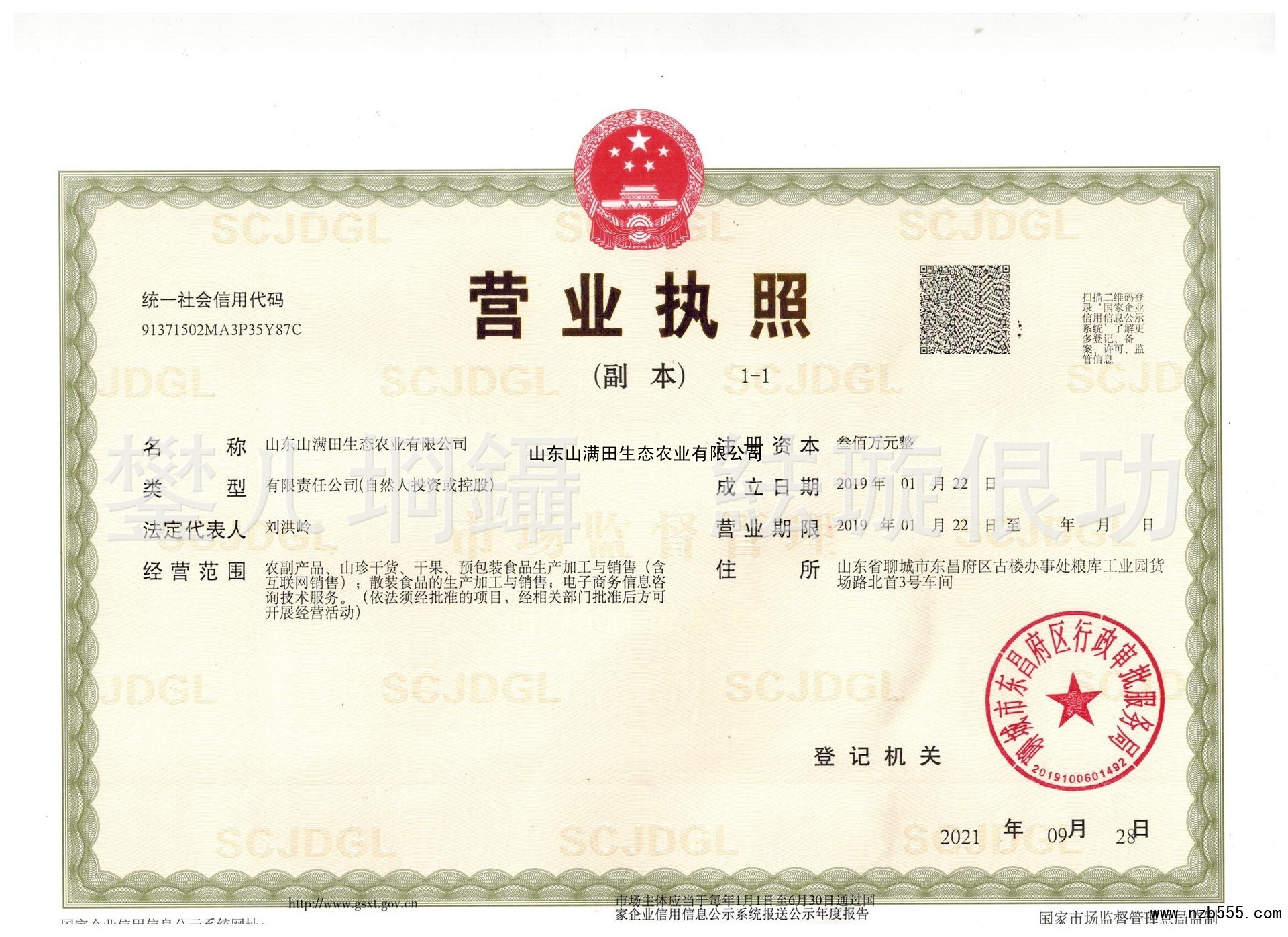 | 發(fā)證機(jī)構(gòu): | 聊城市東昌府區(qū)行政審批服務(wù)局 | 發(fā)證時(shí)間 : | 2021-09-28 |