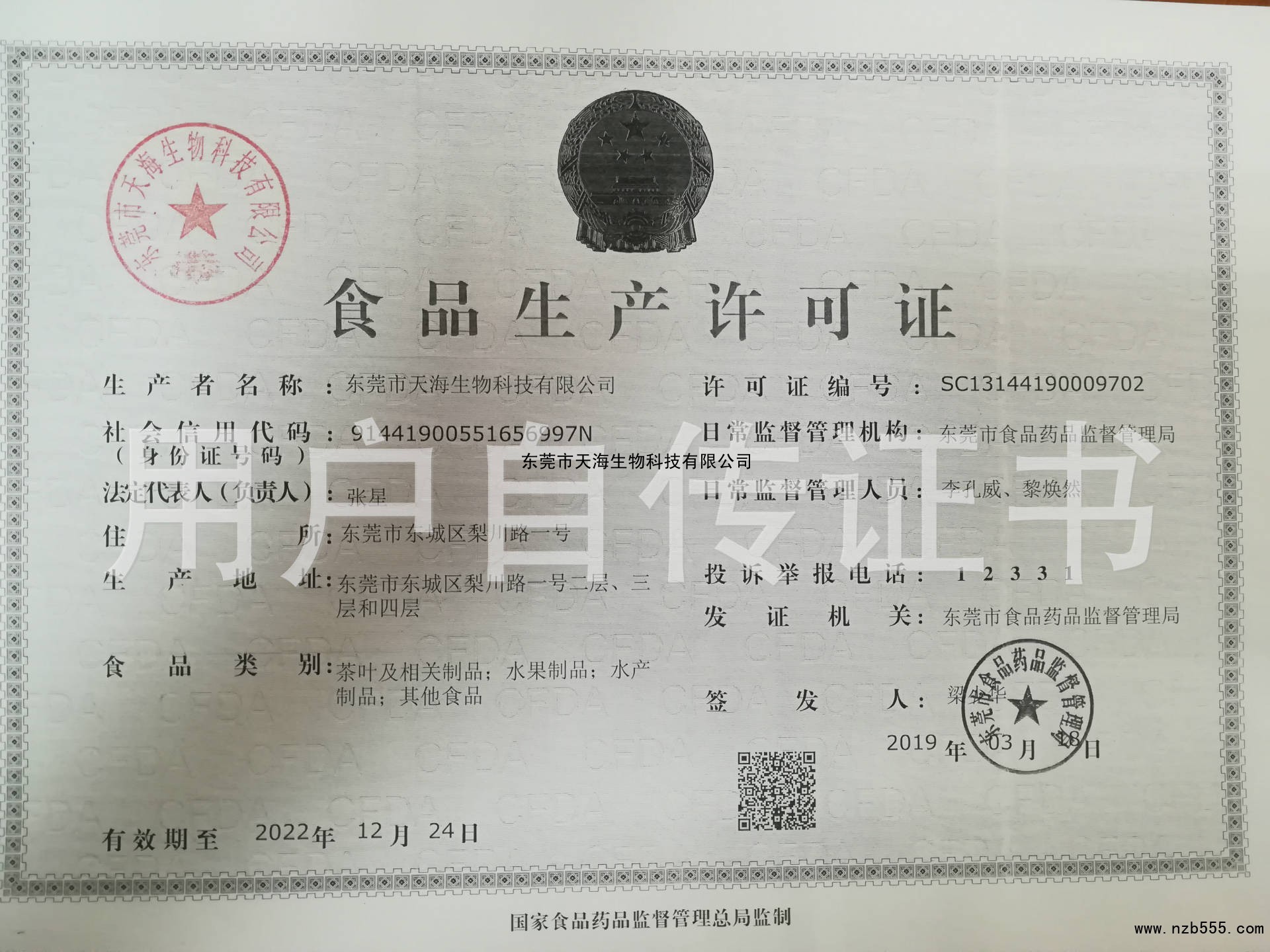 | 發(fā)證機(jī)構(gòu): | 東莞市食品藥品監(jiān)督管理局 | 發(fā)證時(shí)間 : | 2019-03-18 |