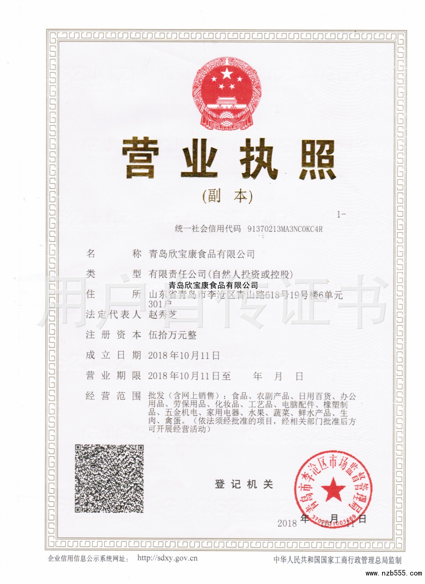 | 發(fā)證機(jī)構(gòu): | 青島市李滄區(qū)市場監(jiān)督管理局 | 發(fā)證時(shí)間 : | 2018-10-11 |