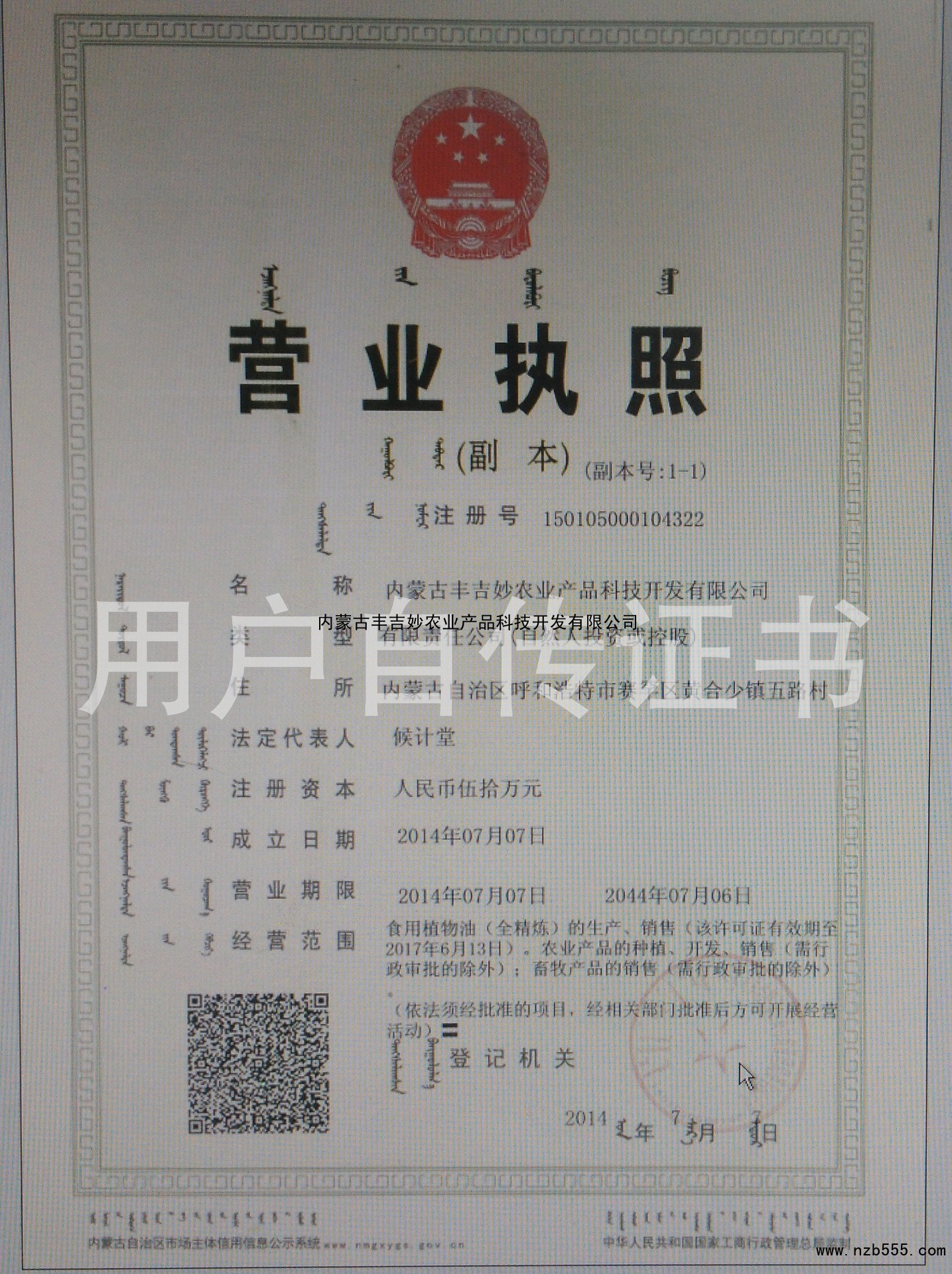 | 發(fā)證機(jī)構(gòu): | 呼和浩特市工商行政管理局賽罕區(qū)分區(qū) | 發(fā)證時間 : | 2014-07-07 |