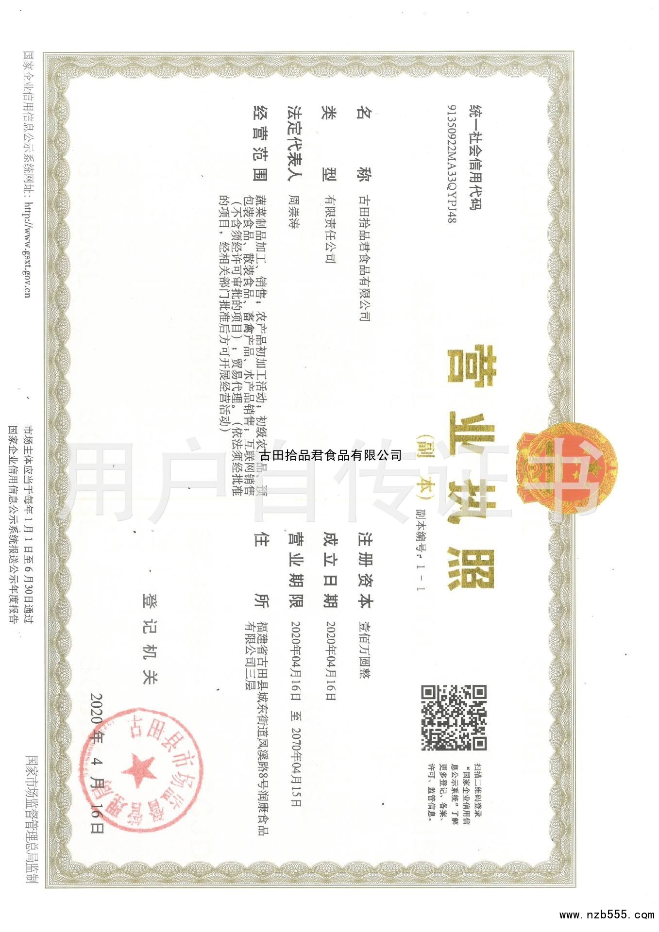 榮譽(yù)資質(zhì) 古田拾品君食品有限公司