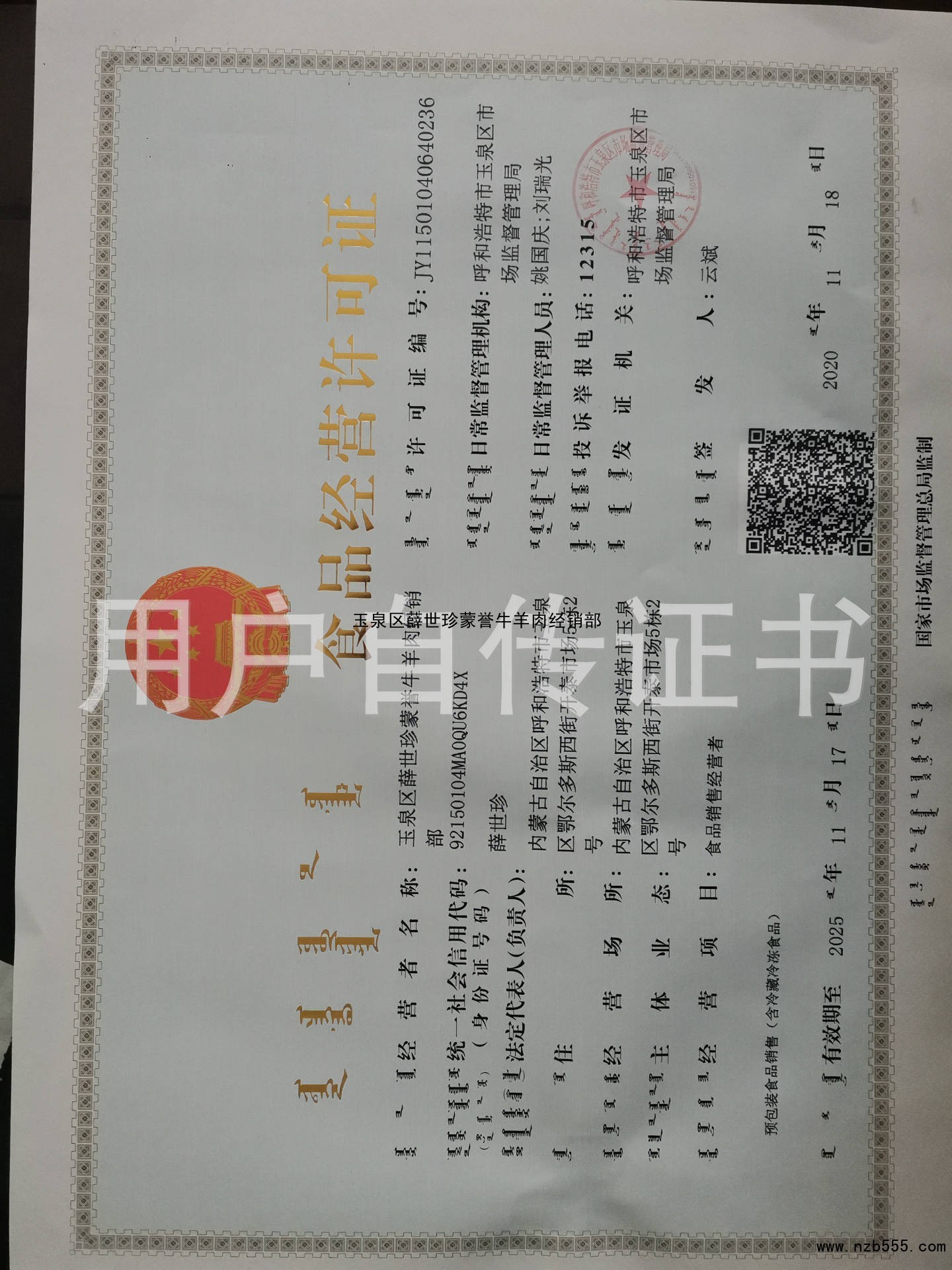 | 發(fā)證機(jī)構(gòu): | 呼和浩特市玉泉區(qū)工商行政管理局 | 發(fā)證時(shí)間 : | 2020-11-18 |