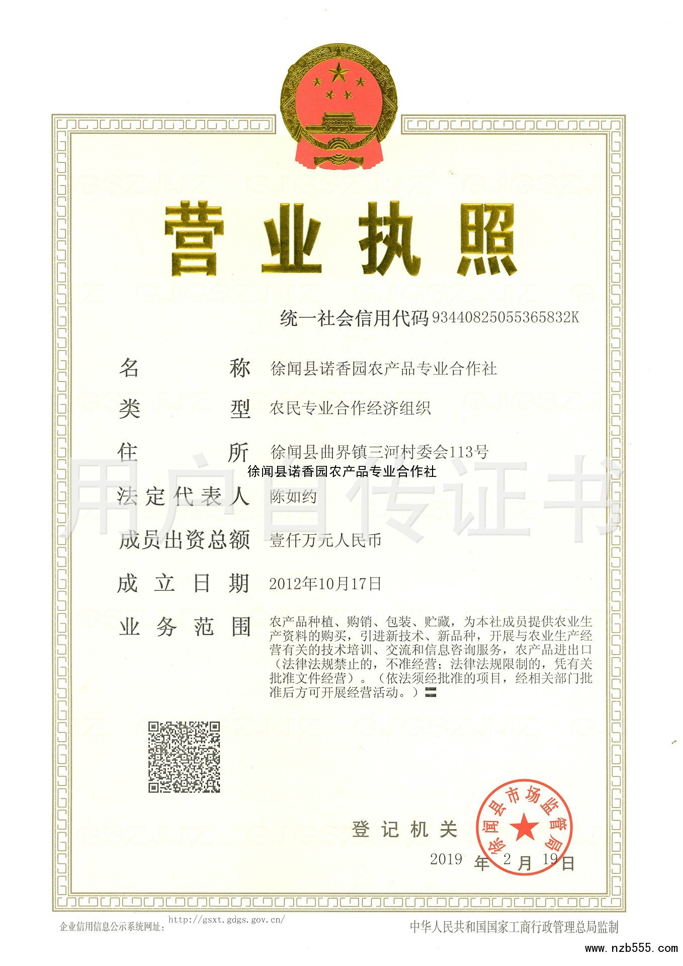 | 發(fā)證機(jī)構(gòu): | 徐聞縣市場(chǎng)監(jiān)督管理局 | 發(fā)證時(shí)間 : | 2019-02-19 |