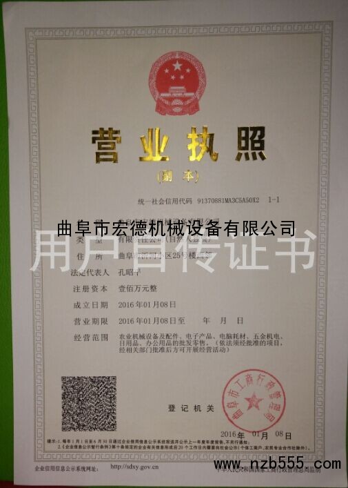 | 發(fā)證機(jī)構(gòu): | 曲阜市工商行政管理局 | 發(fā)證時(shí)間 : | 2016-01-08 |