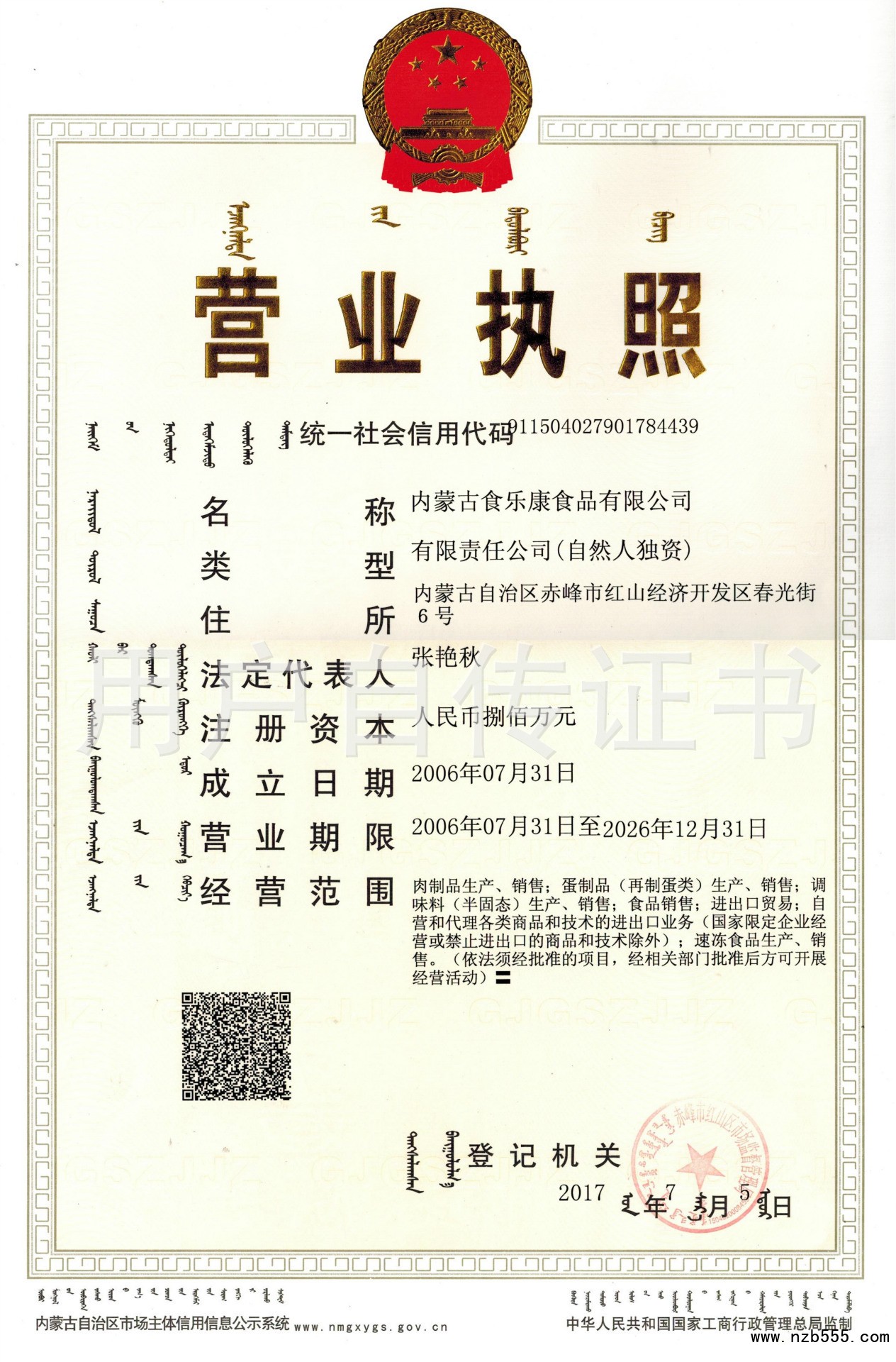 | 發(fā)證機(jī)構(gòu): | 赤峰市市場(chǎng)監(jiān)督管理局 | 發(fā)證時(shí)間 : | 2017-07-05 |