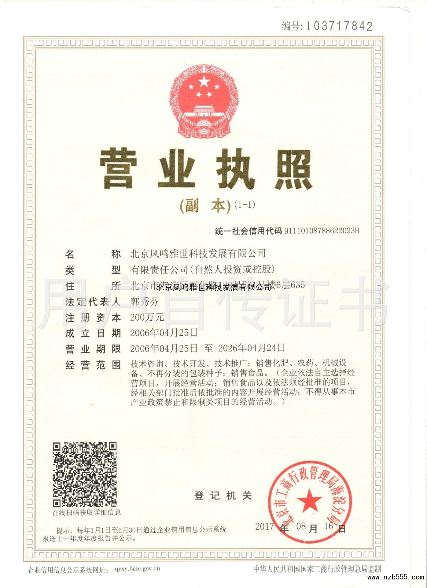 | 發(fā)證機(jī)構(gòu): | 北京市工商行政管理局海淀分局 | 發(fā)證時間 : | 2017-08-16 |