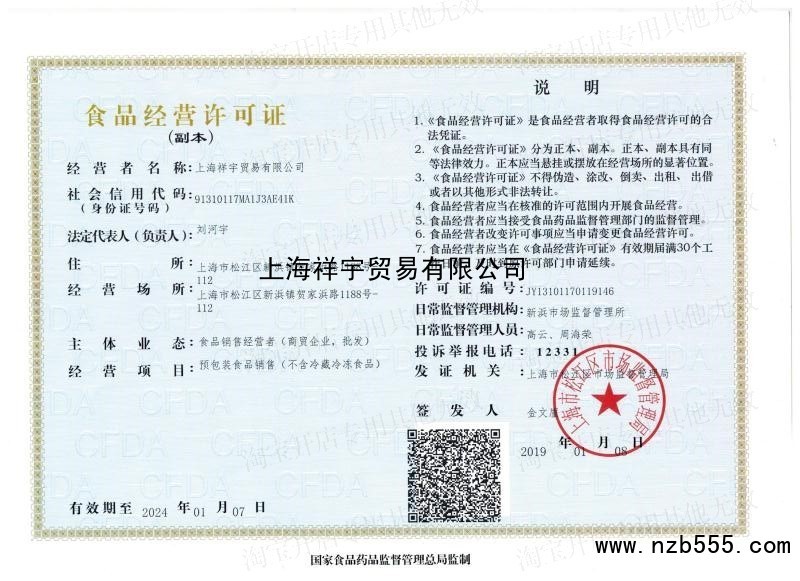 | 發(fā)證機(jī)構(gòu): | 上海市松江區(qū)市場監(jiān)督管理局 | 發(fā)證時間 : | 2019-01-08 |