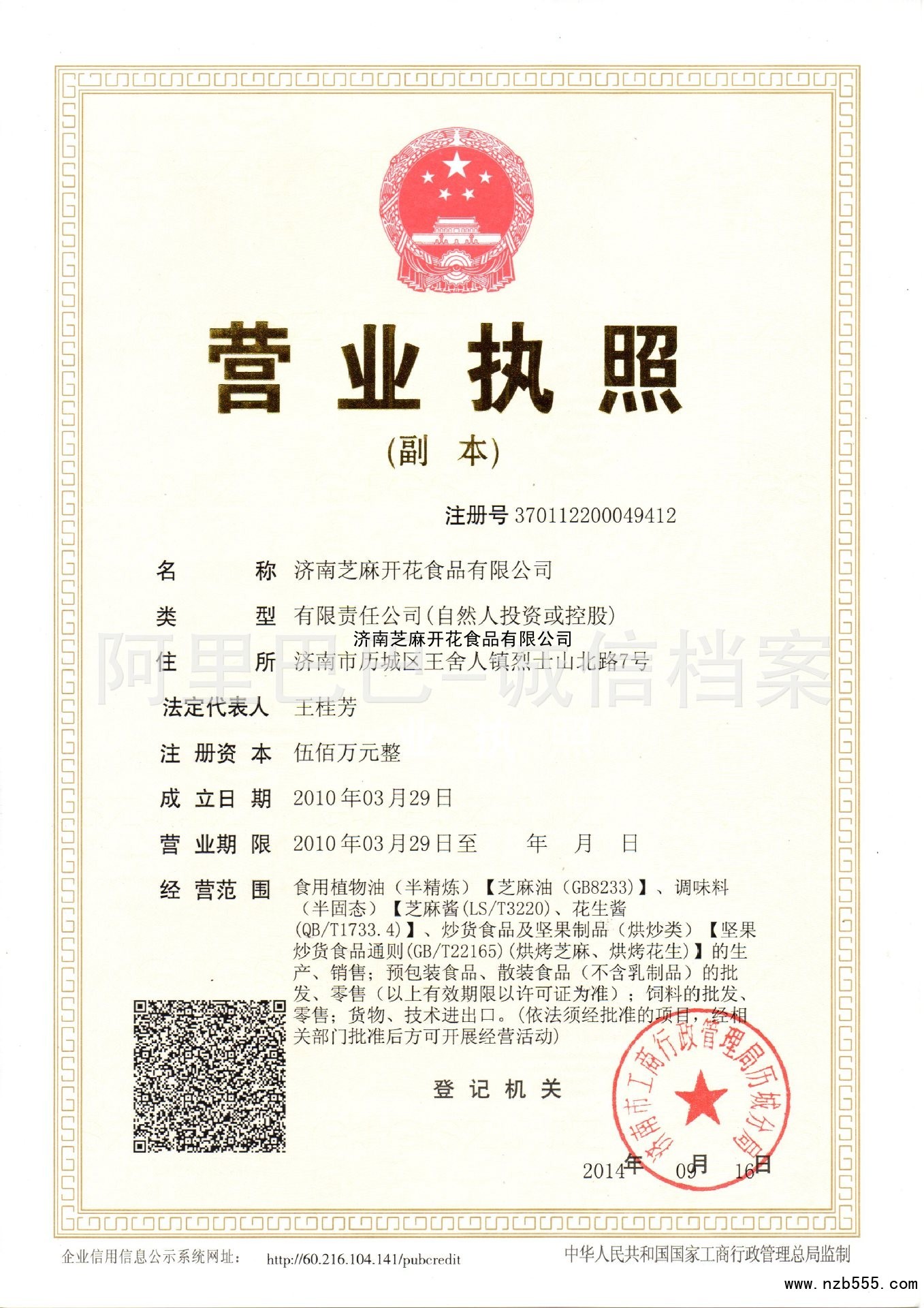 | 發(fā)證機(jī)構(gòu): | 濟(jì)南市工商行政管理局歷城分局 | 發(fā)證時(shí)間 : | 2014-09-16 |