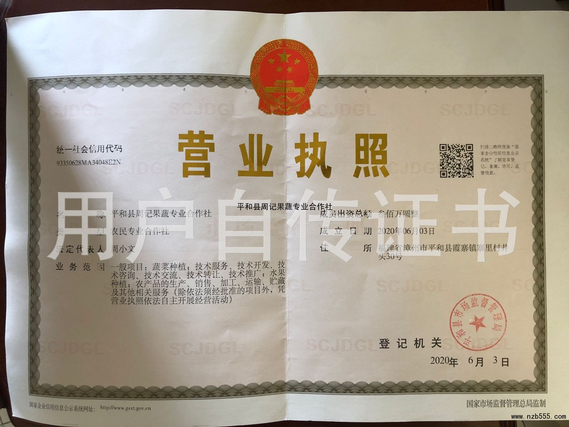 | 發(fā)證機(jī)構(gòu): | 平和縣市場監(jiān)督管理局 | 發(fā)證時間 : | 2020-06-03 |