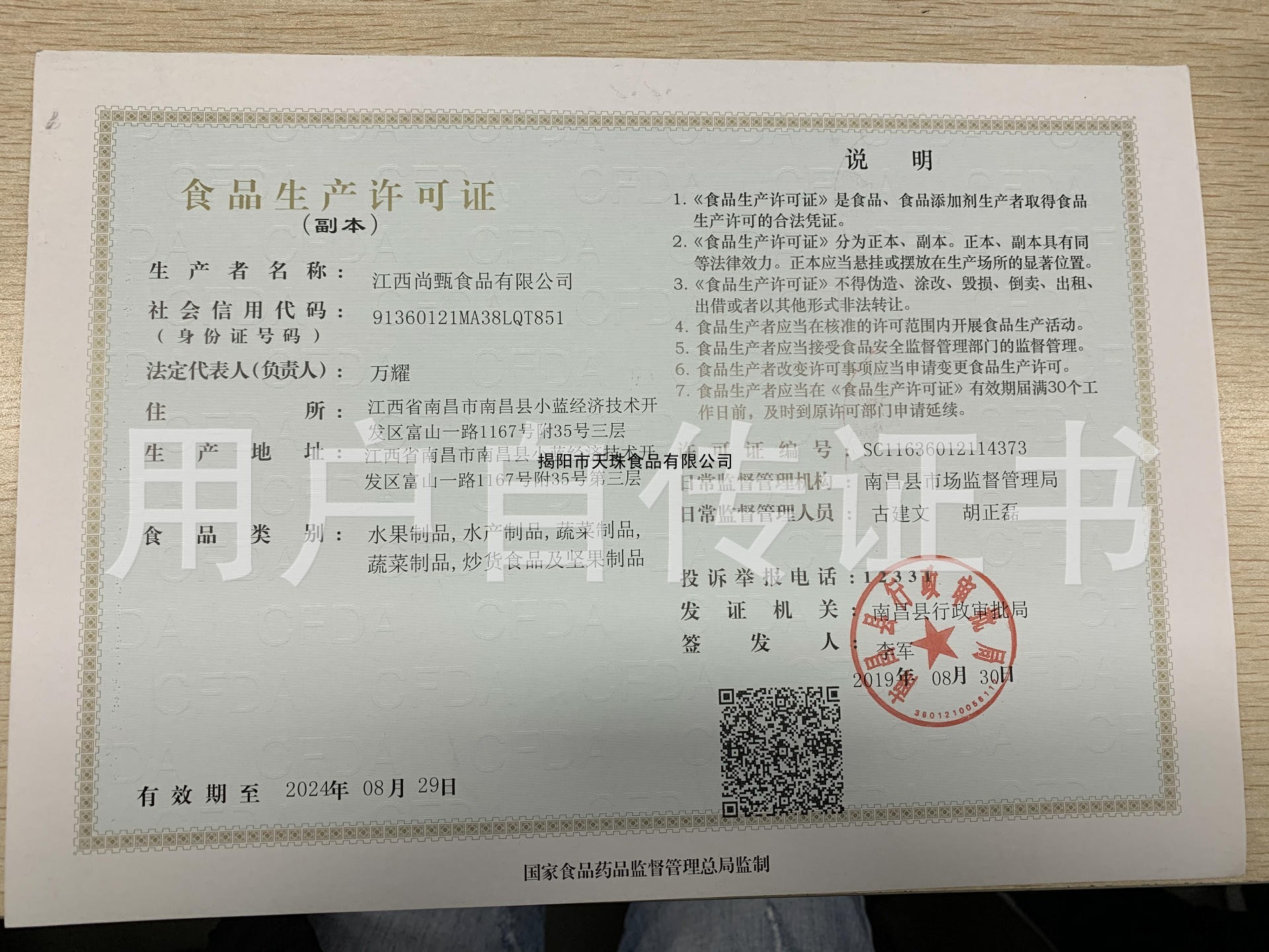 榮譽(yù)資質(zhì) 食品生產(chǎn)許可證(除乳制品、嬰幼兒配方乳粉、酒之外的生產(chǎn)許可證)