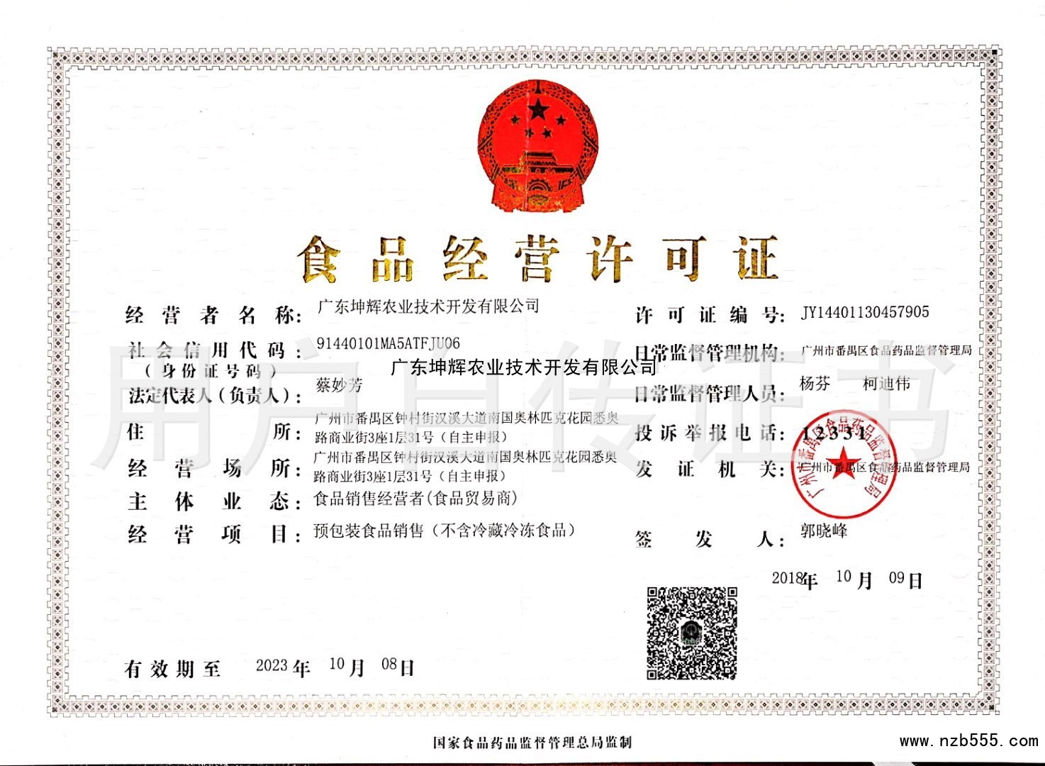 | 發(fā)證機(jī)構(gòu): | 廣州市番禺區(qū)食品藥品監(jiān)督管理局 | 發(fā)證時(shí)間 : | 2018-10-09 |