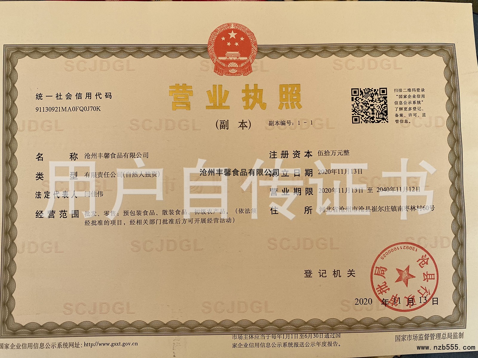 | 發(fā)證機(jī)構(gòu): | 滄縣行政審批局 | 發(fā)證時(shí)間 : | 2020-11-13 |