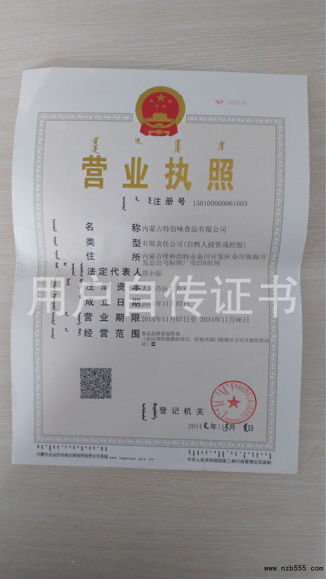 | 發(fā)證機(jī)構(gòu): | 呼和浩特市工商行政管理局 | 發(fā)證時(shí)間 : | 2014-11-07 |