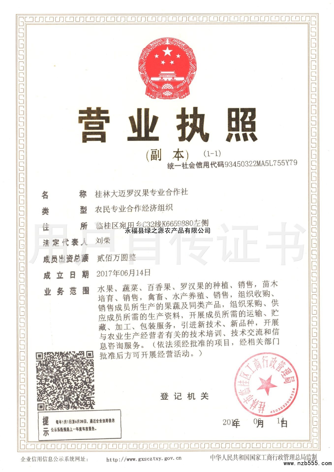 | 發(fā)證機(jī)構(gòu): | 桂林市臨桂區(qū)工商行政管理局 | 發(fā)證時間 : | 2017-06-14 |