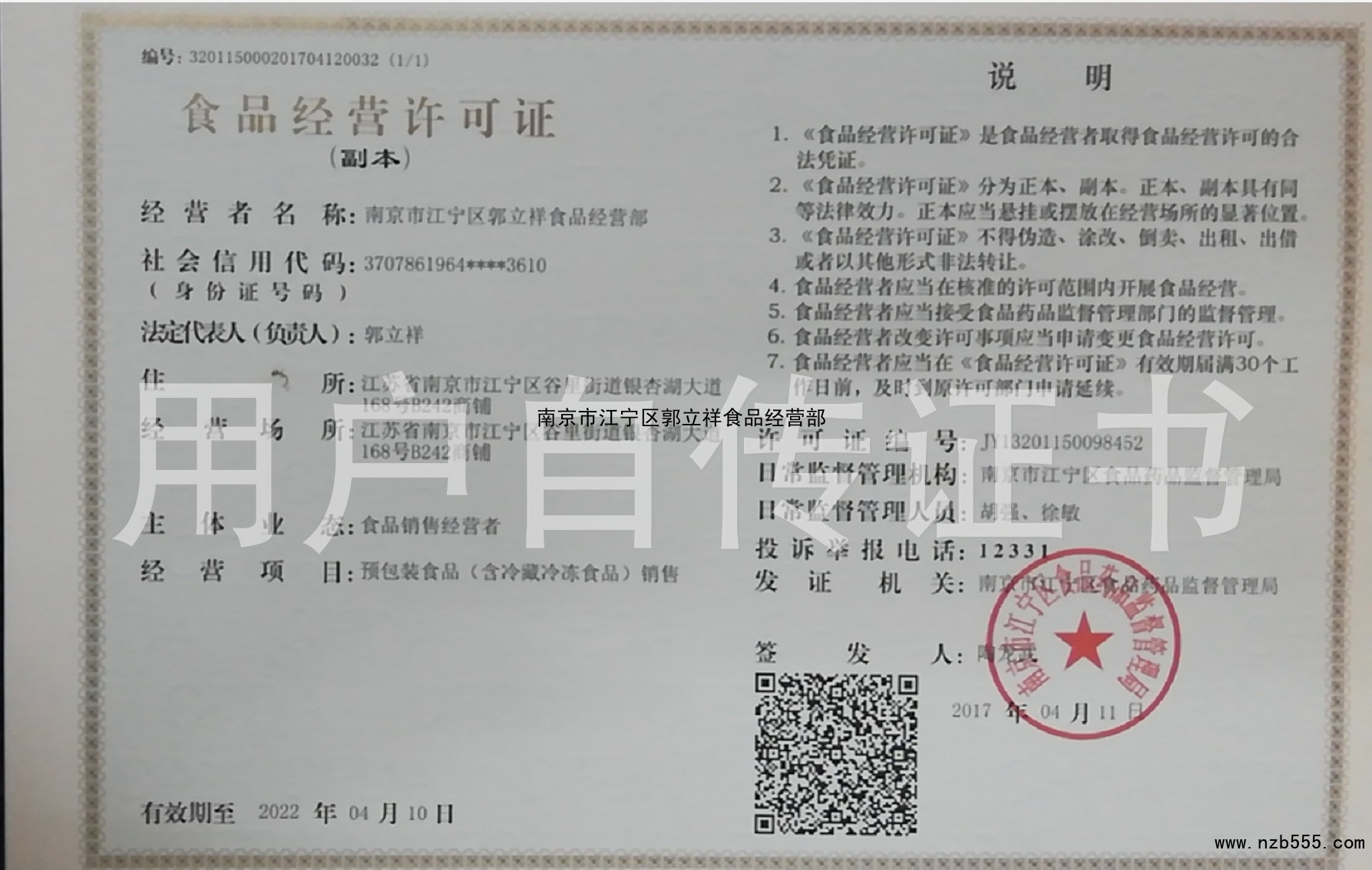| 發(fā)證機(jī)構(gòu): | 南京市江寧區(qū)食品藥品監(jiān)督管理局 | 發(fā)證時(shí)間 : | 2017-04-11 |