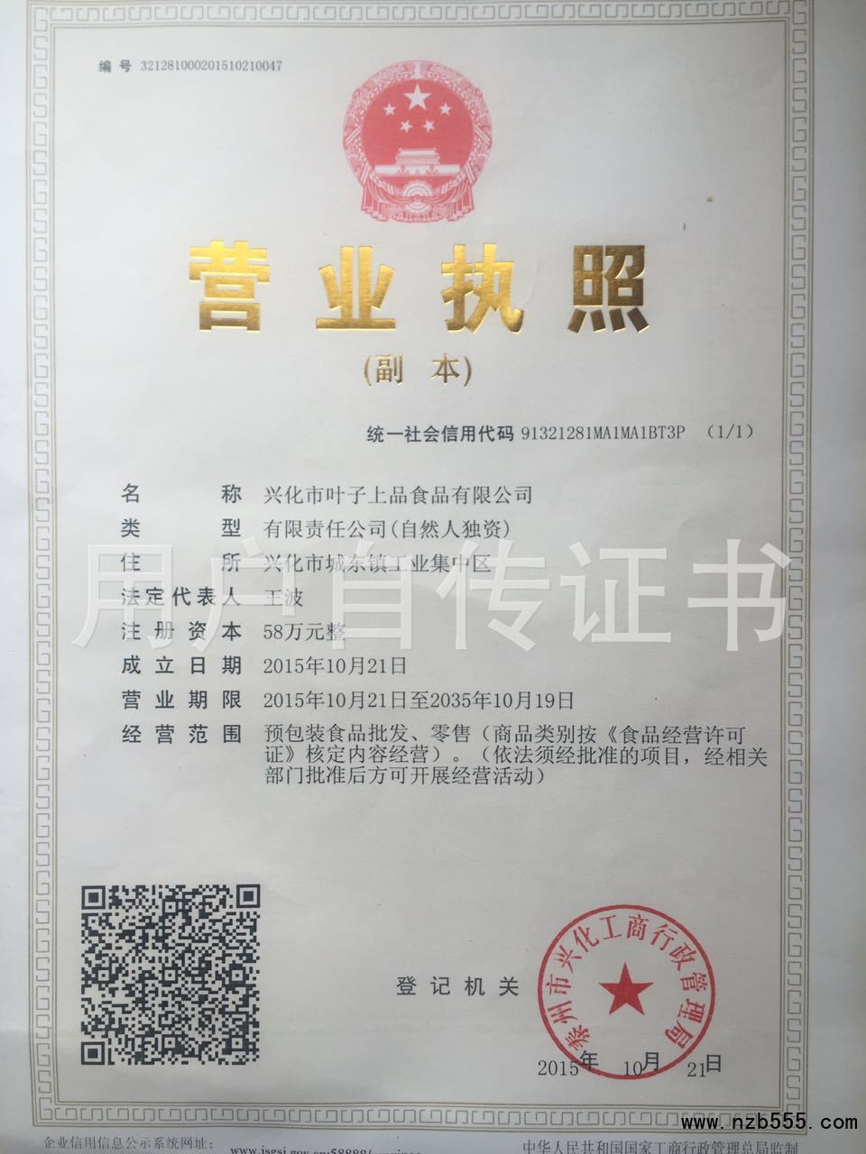 | 發(fā)證機(jī)構(gòu): | 泰州市興化工商行政管理局 | 發(fā)證時(shí)間 : | 2015-10-21 |