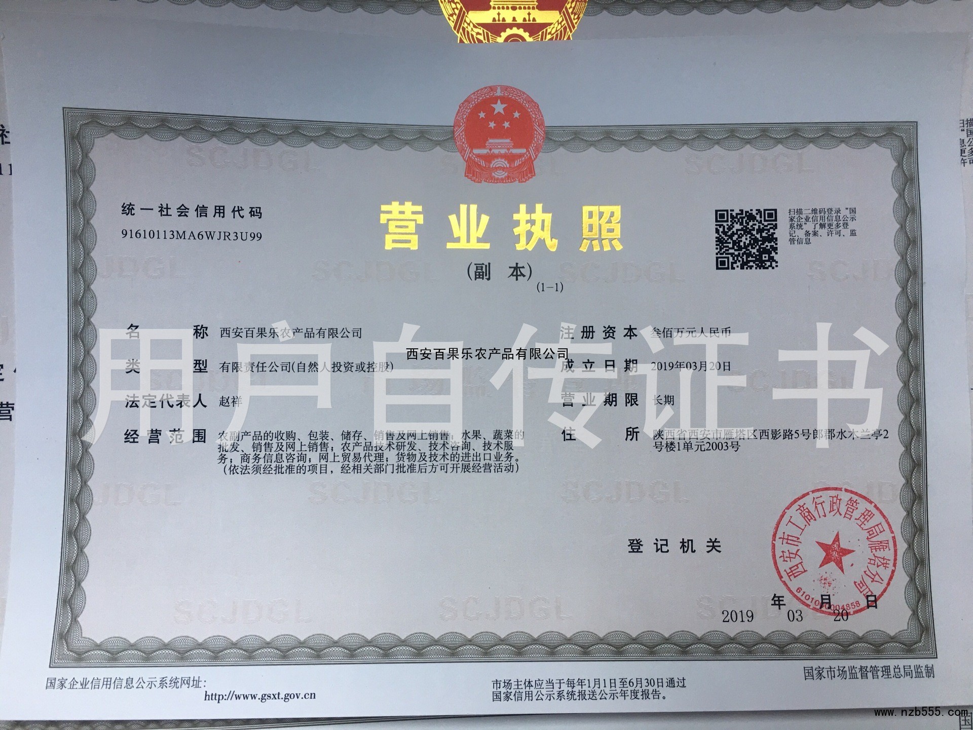 | 發(fā)證機(jī)構(gòu): | 西安市工商行政管理局雁塔分局 | 發(fā)證時(shí)間 : | 2019-03-20 |