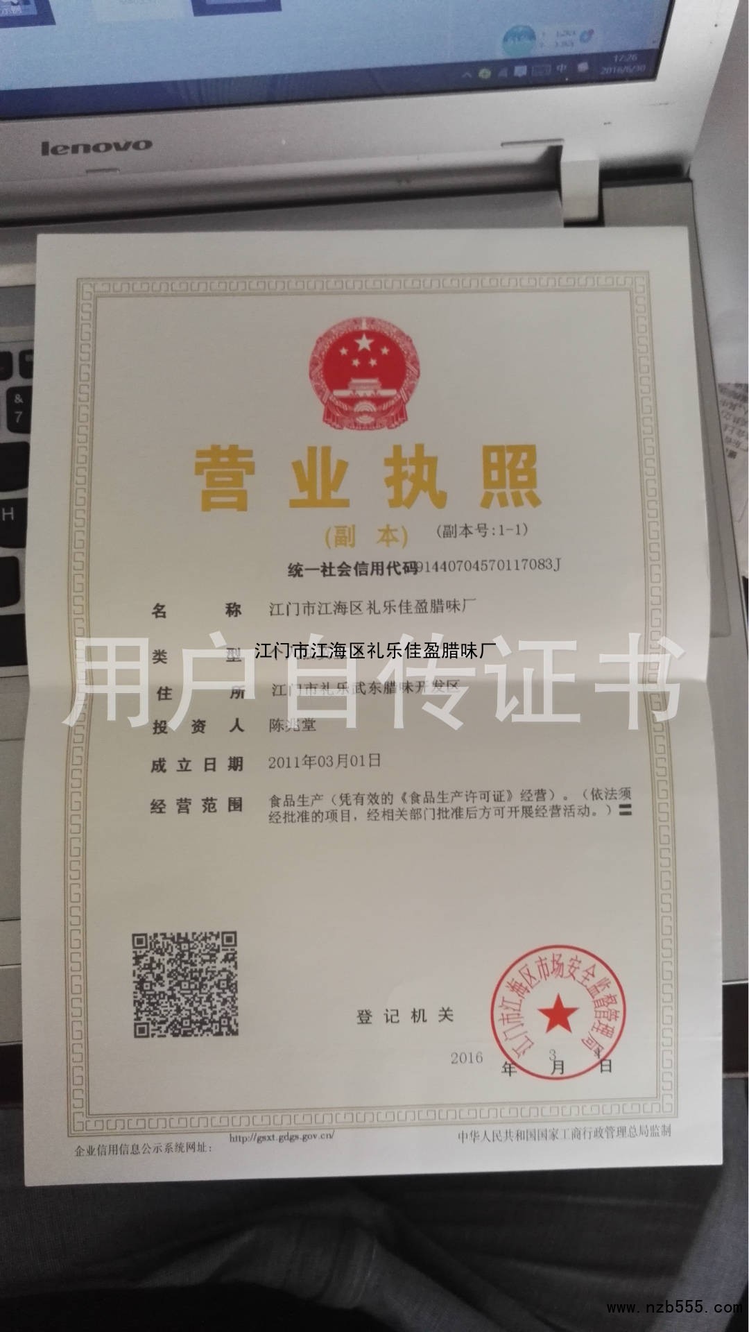 | 發(fā)證機(jī)構(gòu): | 江門市江海區(qū)市場安全監(jiān)督管理局 | 發(fā)證時間 : | 2016-03-04 |
