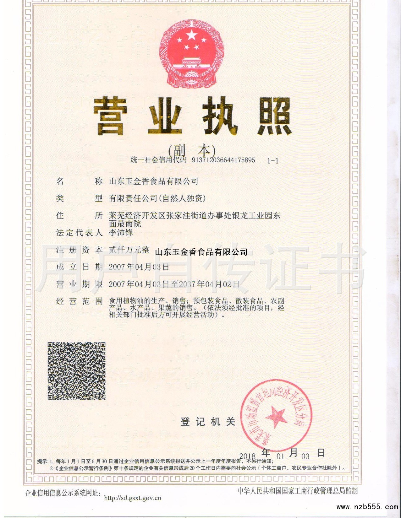 | 發(fā)證機(jī)構(gòu): | 萊蕪市市場(chǎng)監(jiān)督管理局經(jīng)濟(jì)技術(shù)開(kāi)發(fā)區(qū) | 發(fā)證時(shí)間 : | 2018-01-03 |