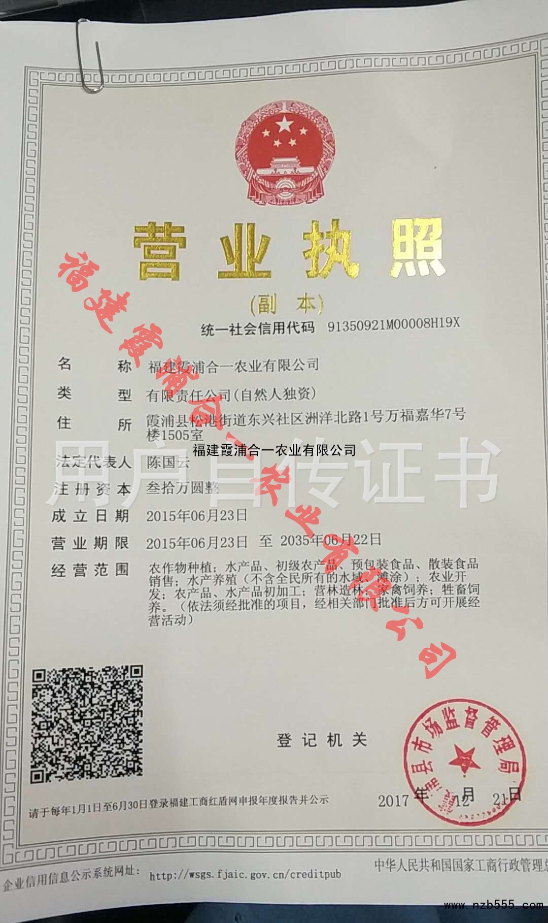 | 發(fā)證機(jī)構(gòu): | 霞浦縣市場(chǎng)監(jiān)督管理局 | 發(fā)證時(shí)間 : | 2017-12-21 |