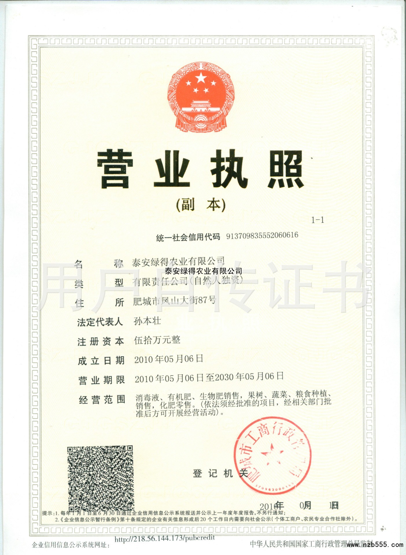 | 發(fā)證機(jī)構(gòu): | 肥城市工商行政管理局 | 發(fā)證時(shí)間 : | 2016-05-10 |