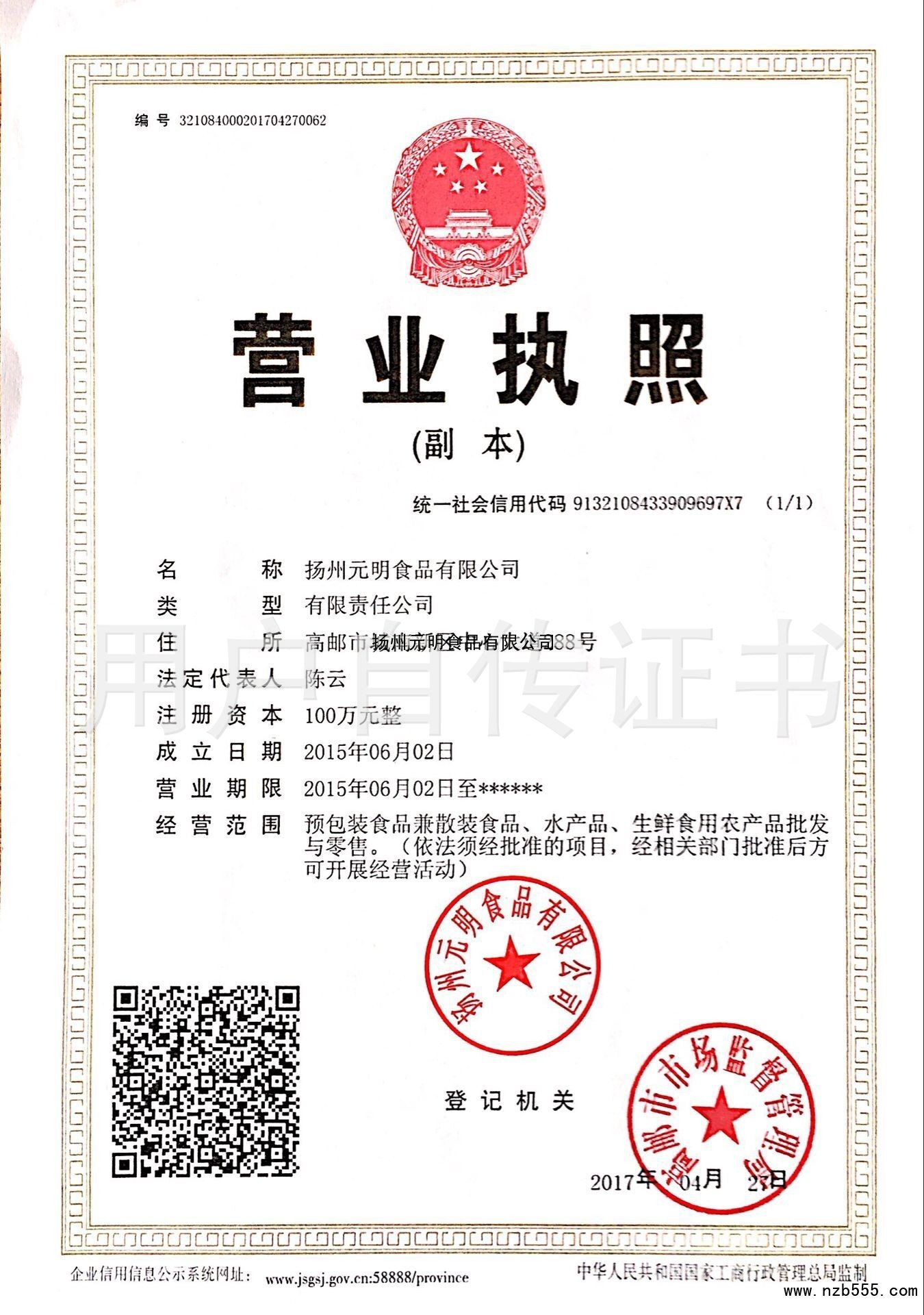 | 發(fā)證機(jī)構(gòu): | 高郵市市場(chǎng)監(jiān)督管理局 | 發(fā)證時(shí)間 : | 2017-04-27 |