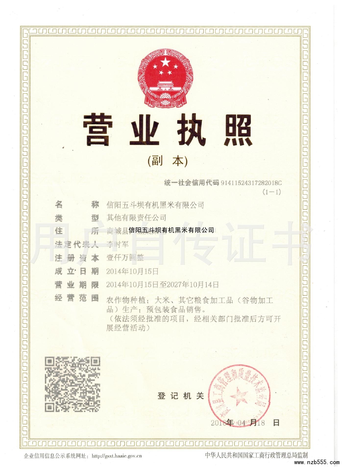 | 發(fā)證機(jī)構(gòu): | 商城縣工商管理和技術(shù)監(jiān)管局 | 發(fā)證時(shí)間 : | 2018-04-18 |