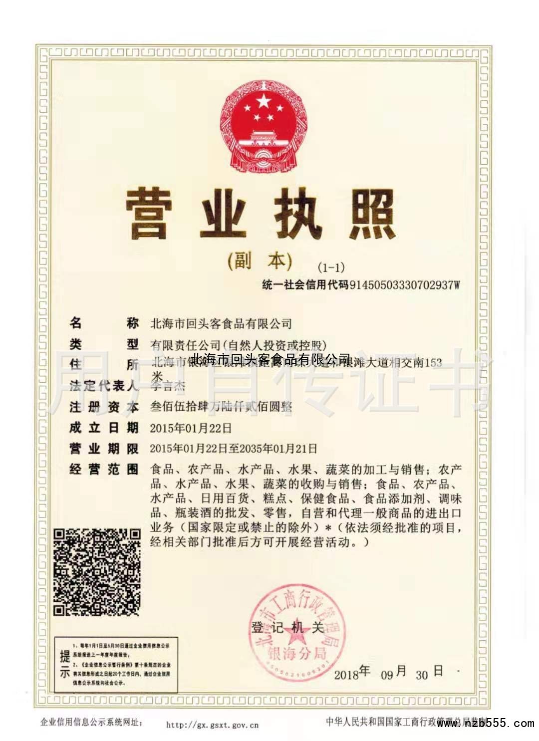 榮譽(yù)資質(zhì) 北海市回頭客食品有限公司