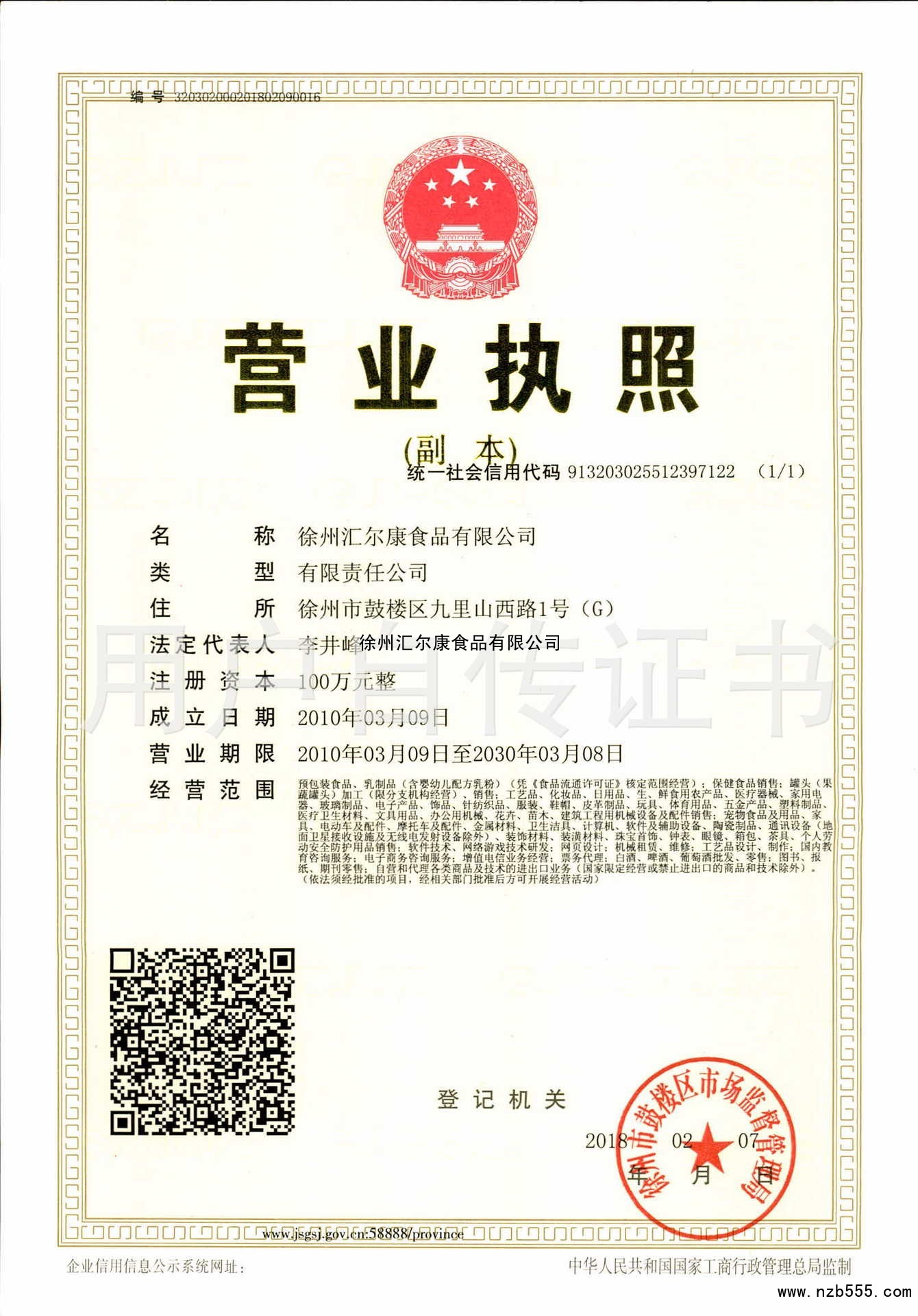 | 發(fā)證機(jī)構(gòu): | 徐州市鼓樓區(qū)市場監(jiān)督管理局 | 發(fā)證時間 : | 2018-02-07 |
